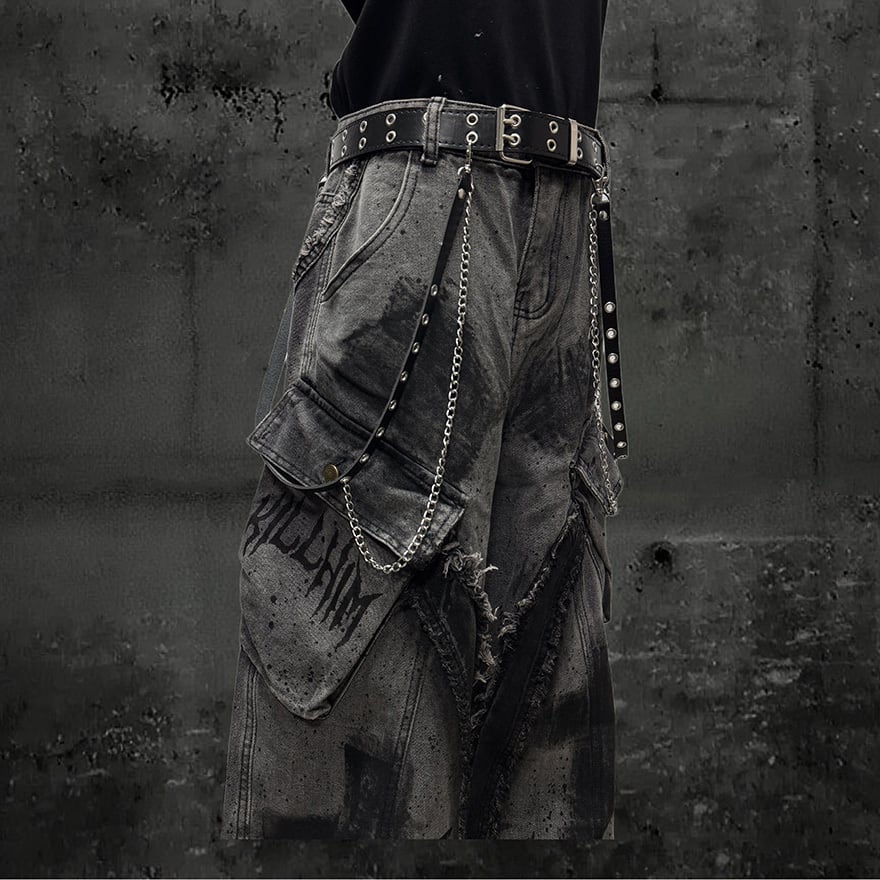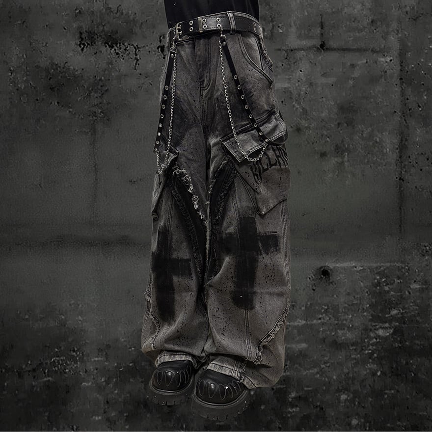 墨を纏ったような十字架グラフィティ 極太ワイドカーゴデニム パンク×ゴシックストリートの核心 |WithU
