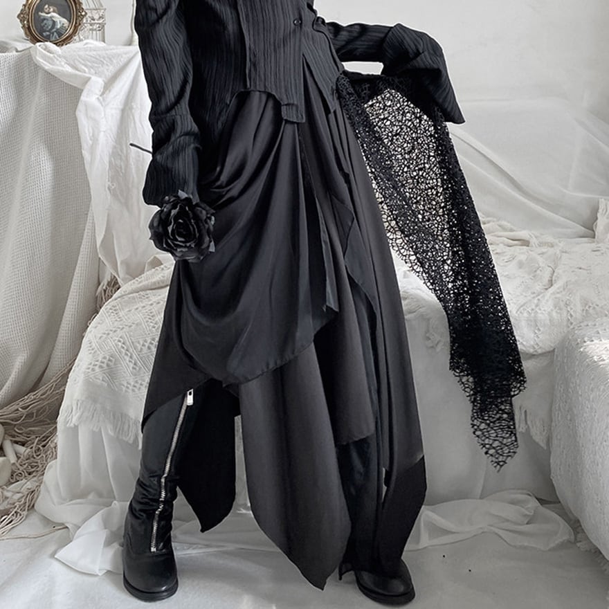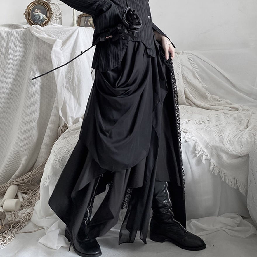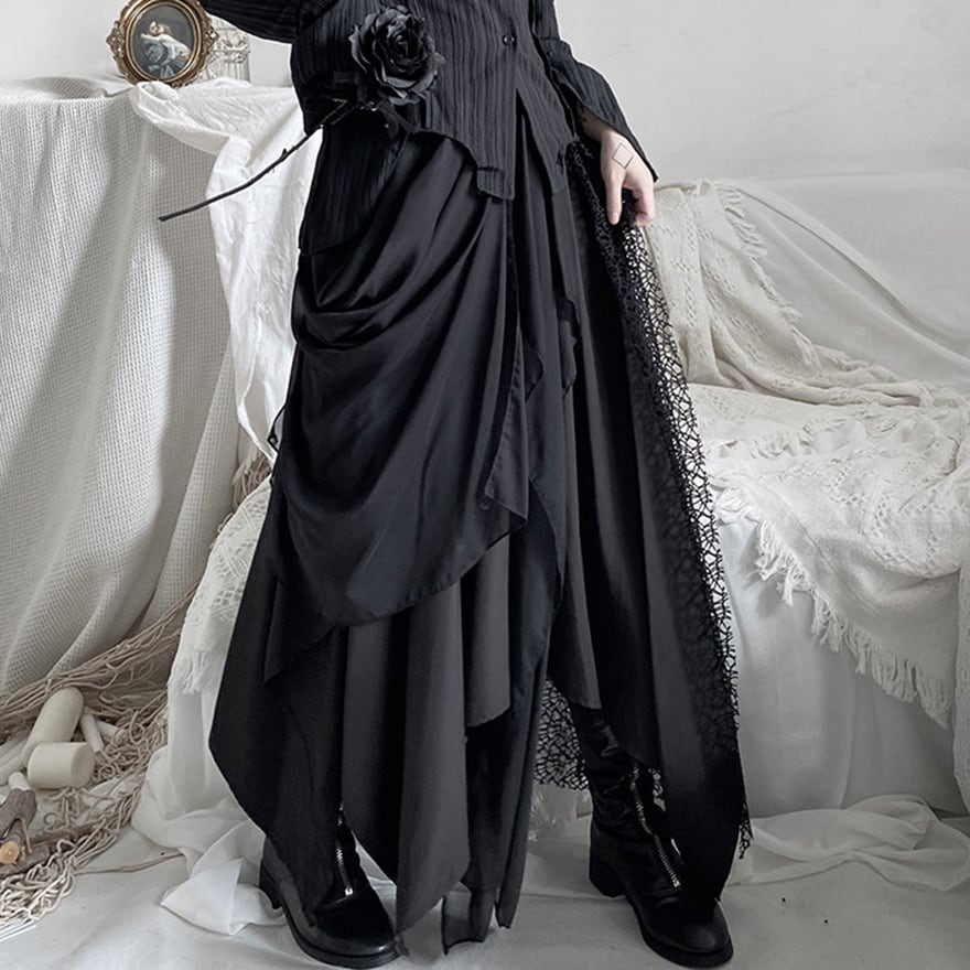 不規則にドレープが重なる非対称シルエットに、サイドのレースパネルを組み合わせた黒のロングスカートです。ウエストから裾にかけて複数の生地が層を成す構造が、歩くたびに異なる表情を見せ、退廃的で物語性のある大人ゴシックの世界観を纏えます。