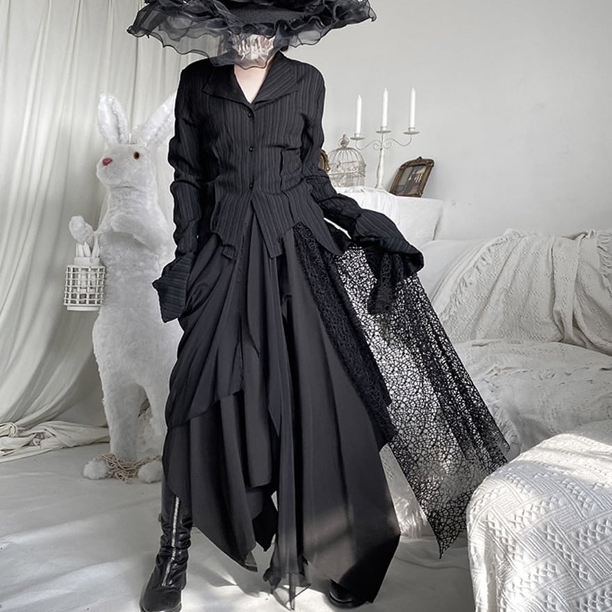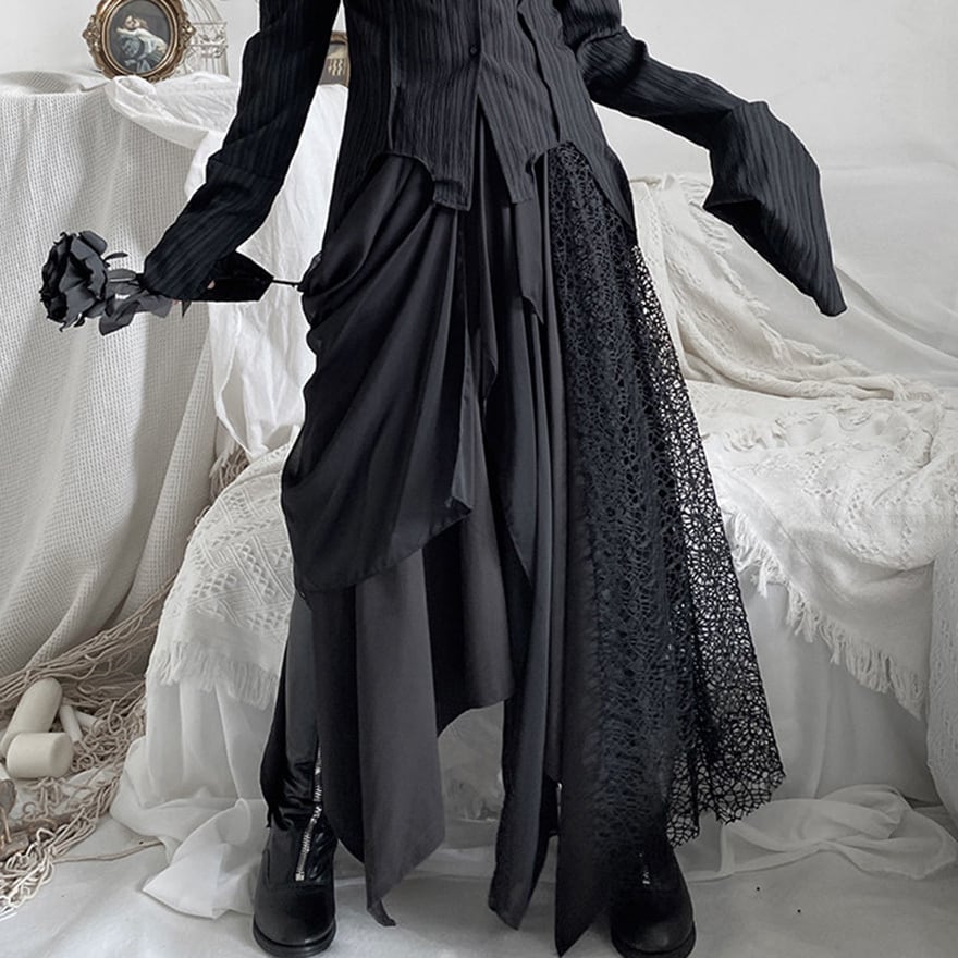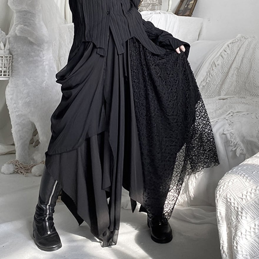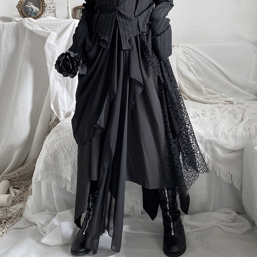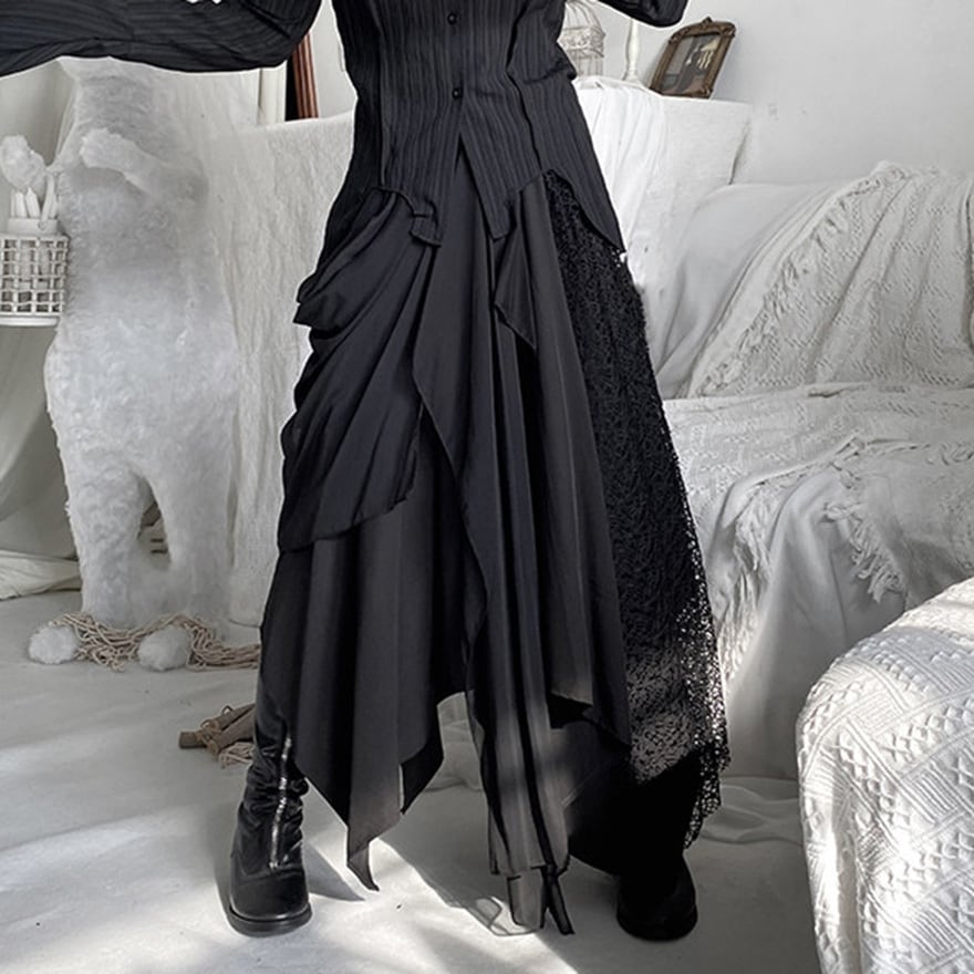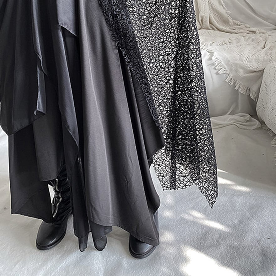 動くたびに揺れる黒の非対称レイヤード レース切替ロングスカート 退廃的な大人ゴシックの存在感 |WithU