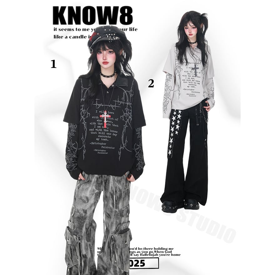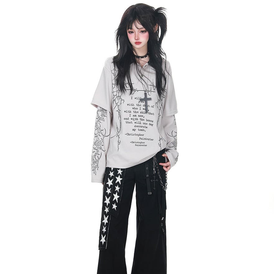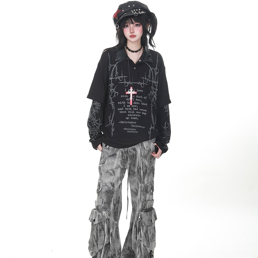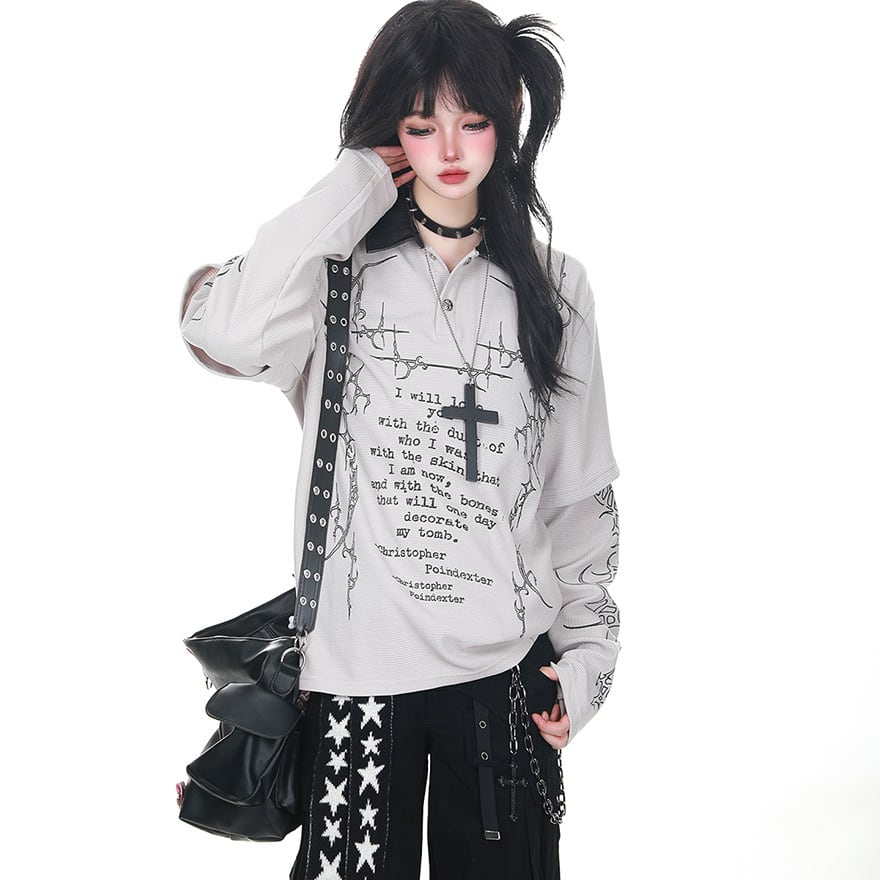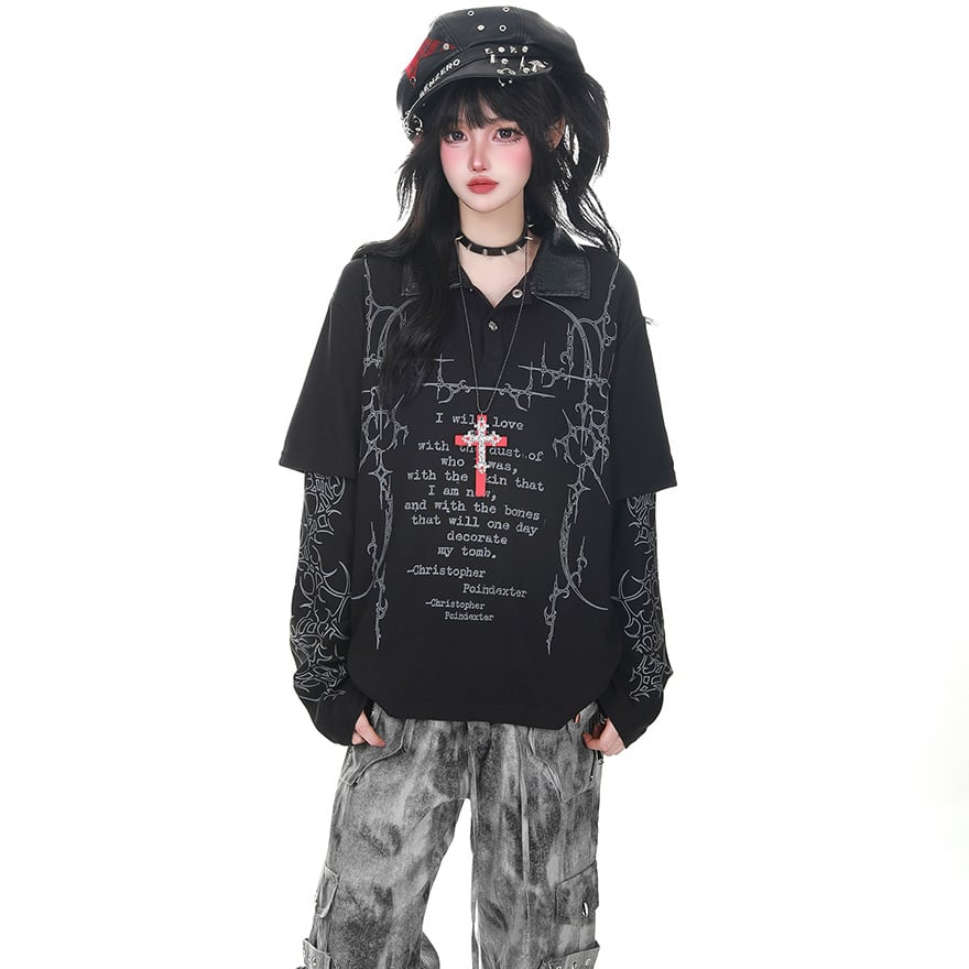 ブラック・グレー展開のオーバーサイズトップスで、重ね着風の2層構造が特徴。有刺鉄線・十字架・詩文をモチーフにしたグラフィックプリントが全面に広がり、着るだけでパンクゴシックのコーデが完結します。ライブ参戦・撮影会・ストリートスナップで映える、手軽に個性を出したい方にぴったりの一枚です。