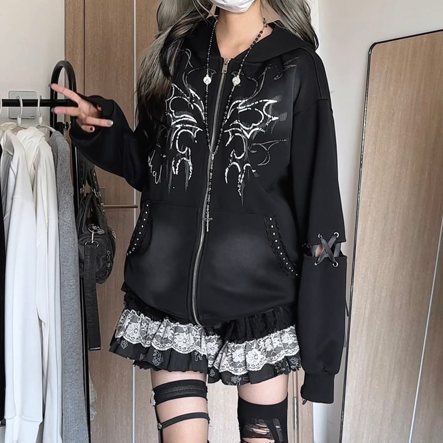 「パンクに挑戦したいけれど、辛くなりすぎるのが怖い」という方にこそ向いています。このパーカーはうさ耳フードとシルバープリントの組み合わせで甘辛のバランスが絶妙に保たれており、インナーにロゴTシャツ一枚合わせるだけでパンク×地雷系の完成したコーデが成立します。オーバーサイズのシルエットで体型を選ばず、カーゴパンツとも相性抜群です。