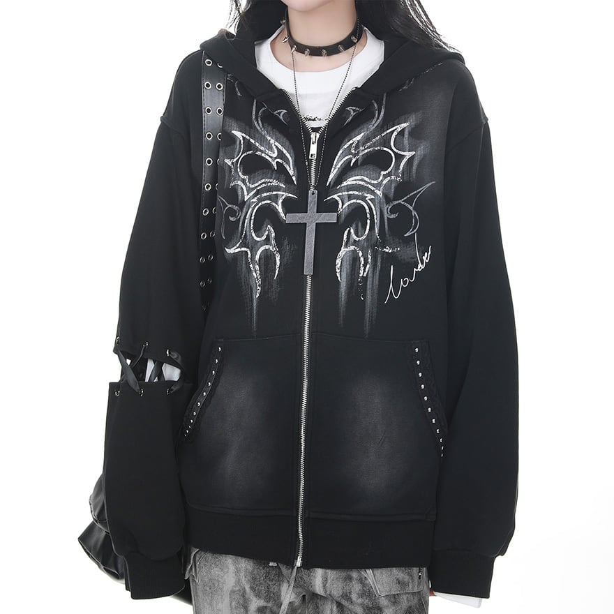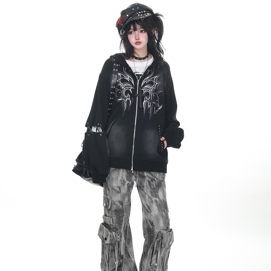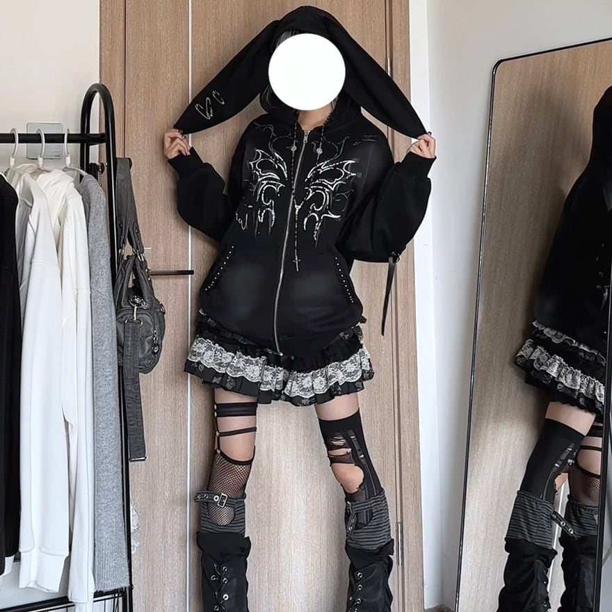 うさ耳フード・スタッズ装飾・シルバーゴシックプリントを組み合わせた黒のジップアップフーディーで、ライブ参戦・撮影会・パンクイベントで圧倒的な存在感を放ちたい方に最適です。甘さと辛さが交差するデザインが、地雷系・パンク双方のコーデにひとつで応えます。
