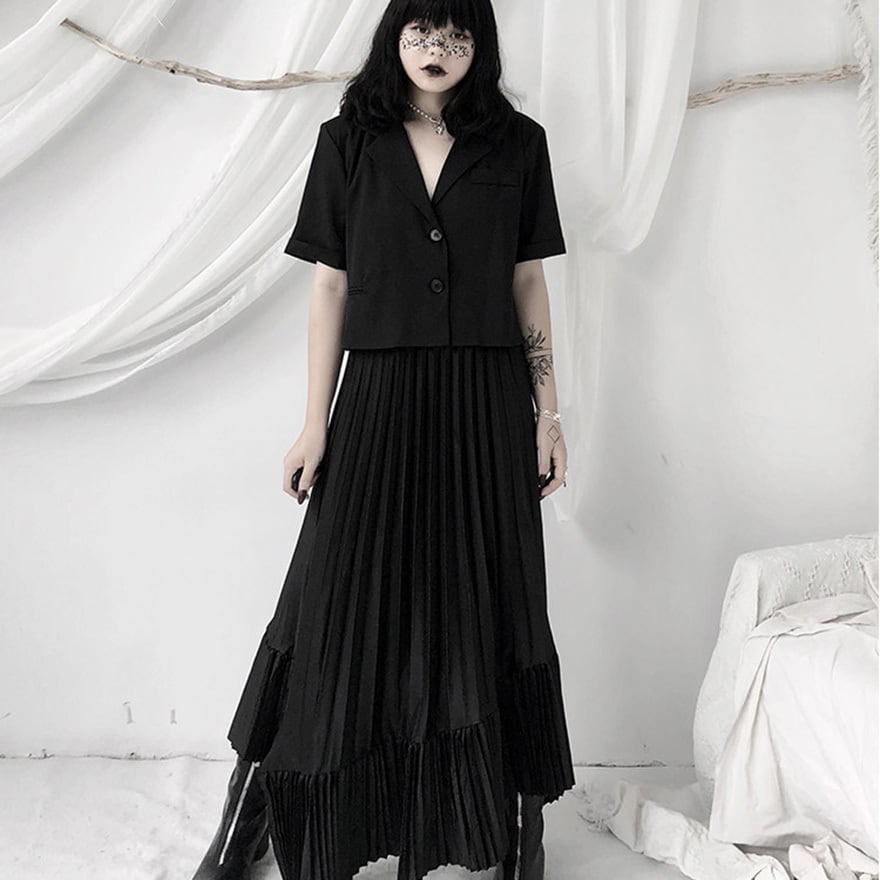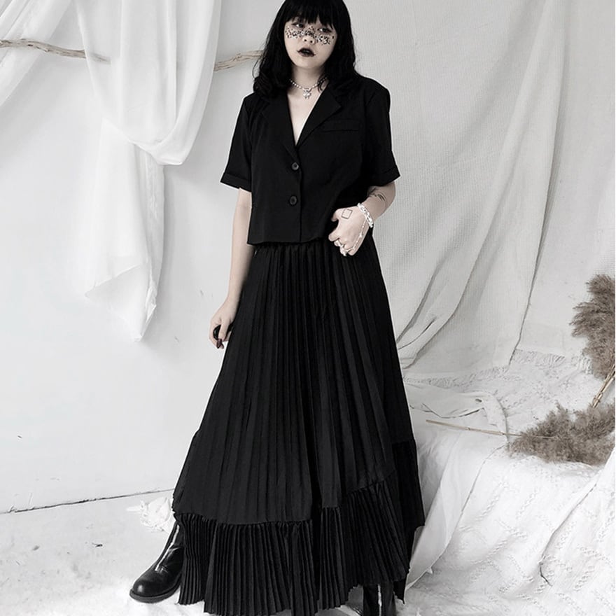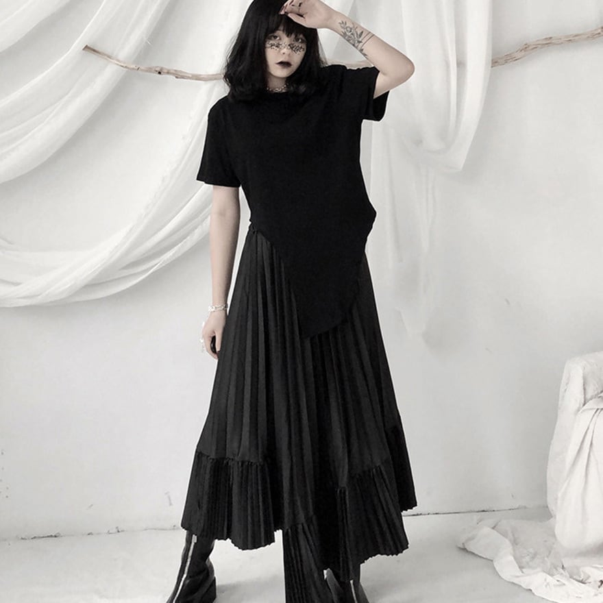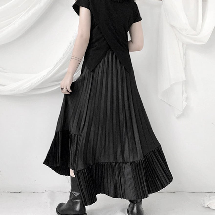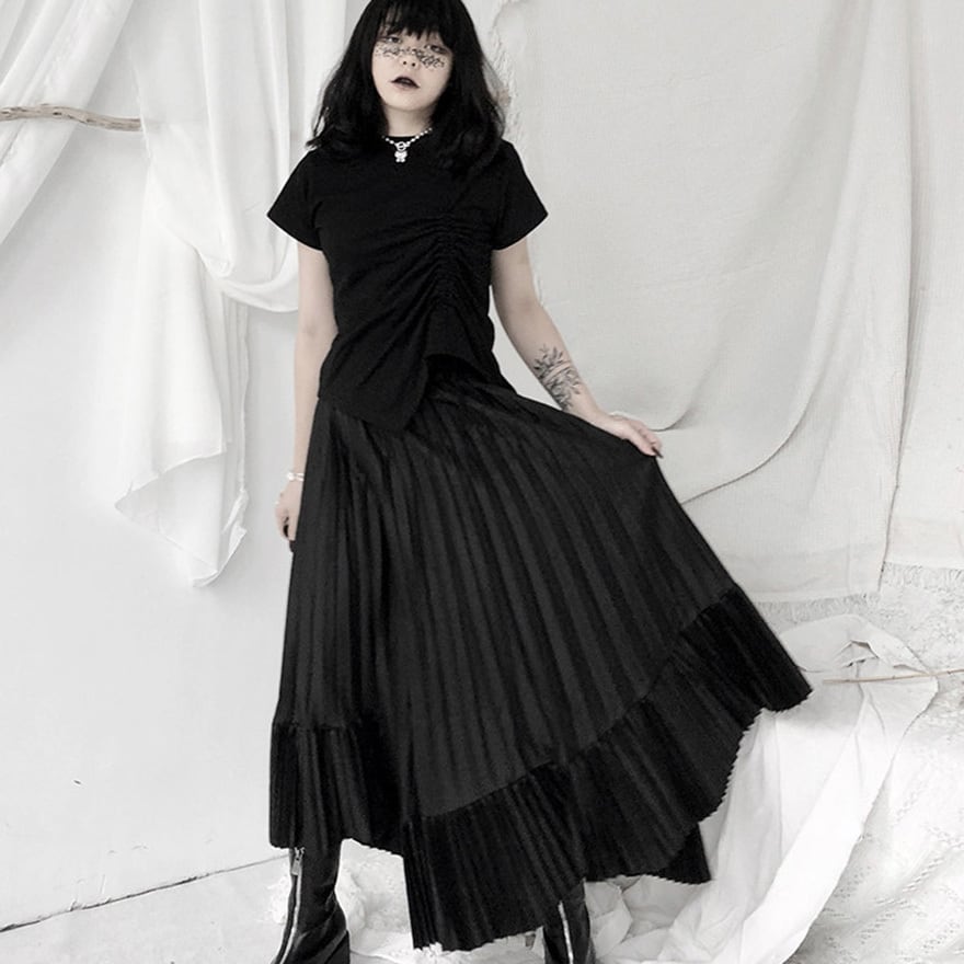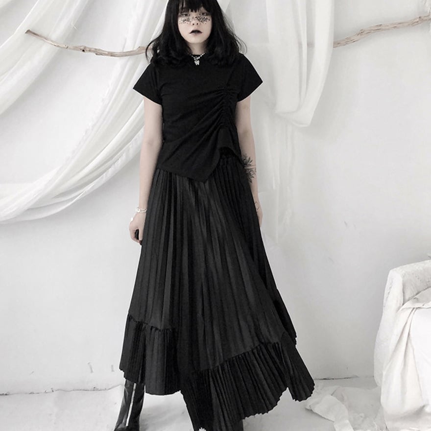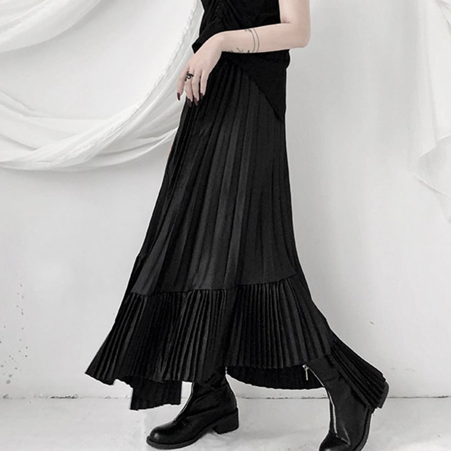 「ゴシックスカートを探しているけれど、フリルやレースが多すぎて大人っぽく着こなせない」という方にこそ向いています。このスカートは装飾を極限まで削ぎ落とし、プリーツの縦ラインとティアードの重なりだけで構成されているため、黒のトップスやブラウスと合わせるだけで洗練されたモードなゴシックコーデが完成します。甘さを求めない大人のゴシックスタイルに、そのまま応えられる一枚です。