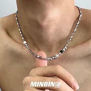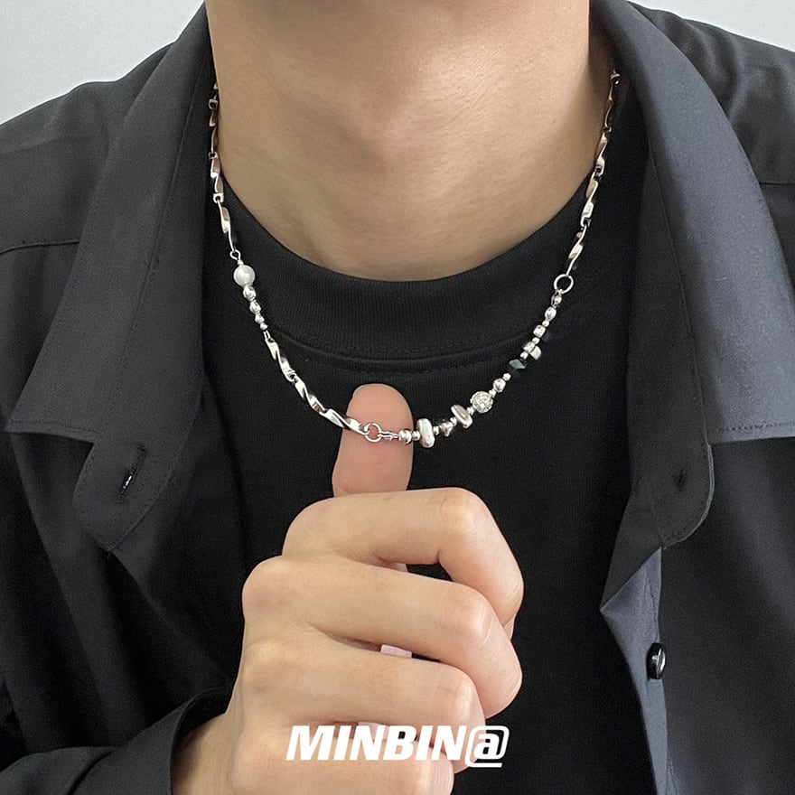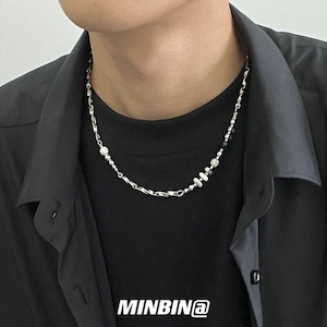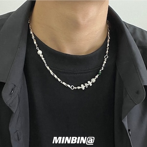 シルバーチェーンとビーズパーツを組み合わせたアシンメトリーデザインのネックレス。シンプルながら個性的なバランスが特徴で、ゴシックやパンク、ストリートコーデの首元にさりげないアクセントを加えます。ユニセックスで使いやすいデザインのため、メンズライクなスタイルや地雷系コーデにも合わせやすいアクセサリーです。重ね付けにもおすすめ。