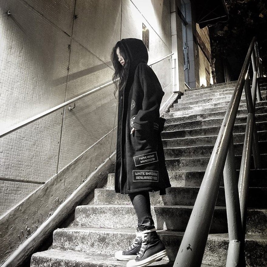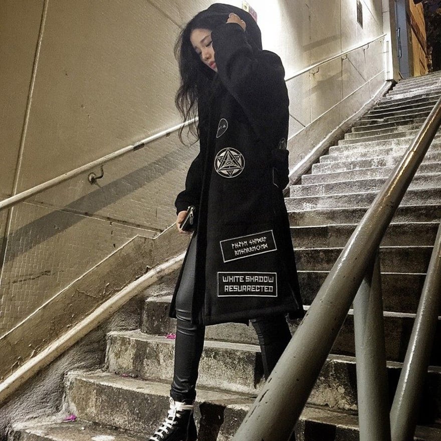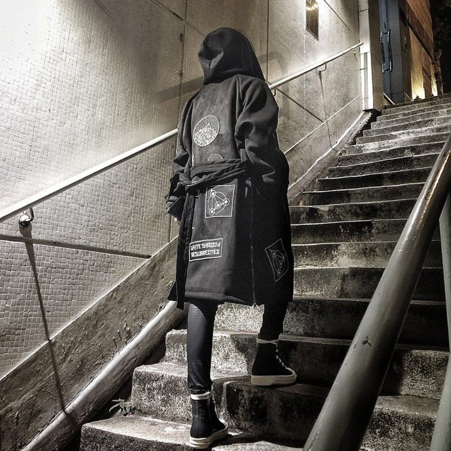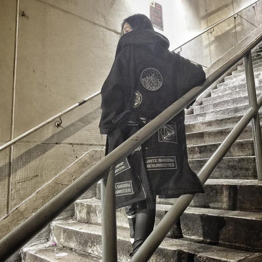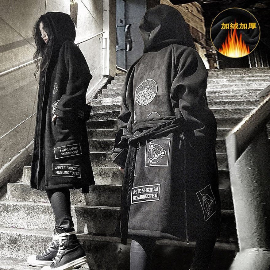 サイバーパンク系の黒地をベースに白い幾何学的な紋章や「白い影の復活」を意味する欧文パッチを各所に配したロング丈のフーディガウンです。