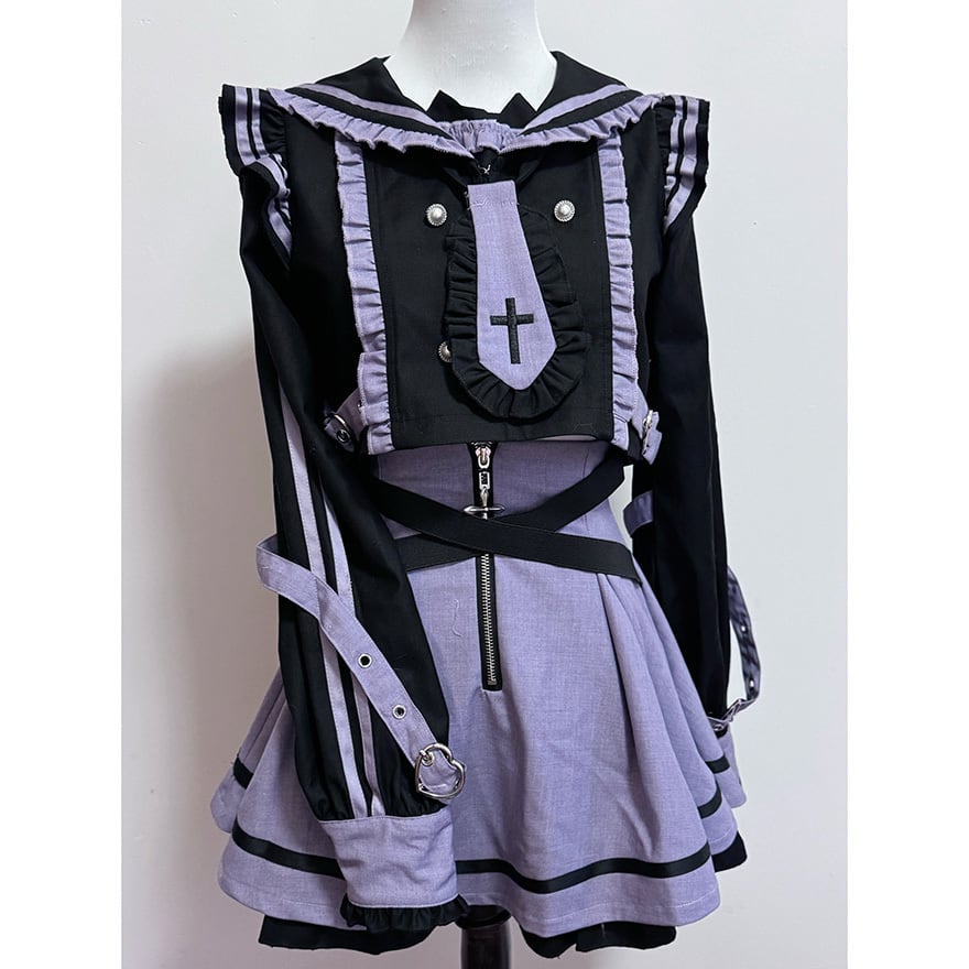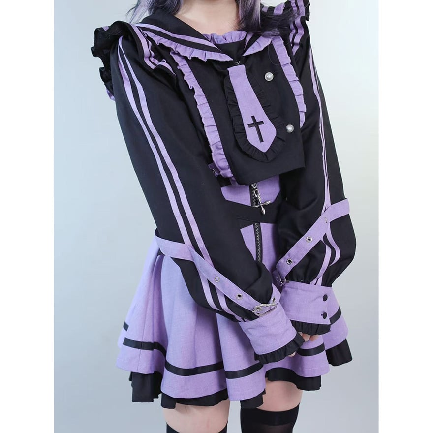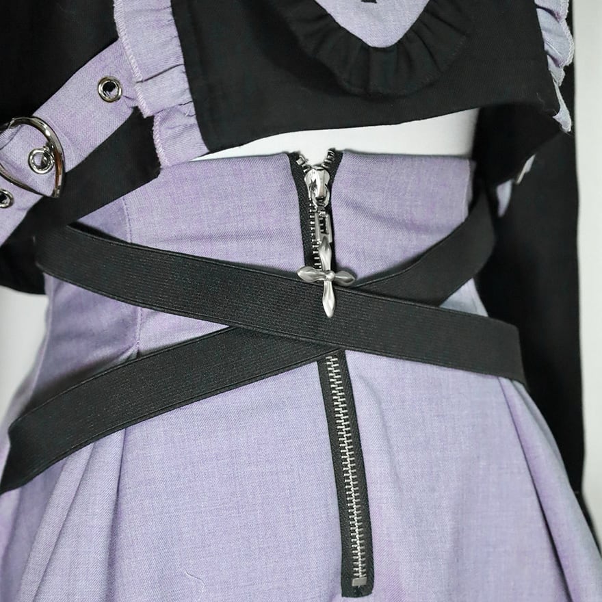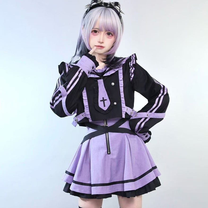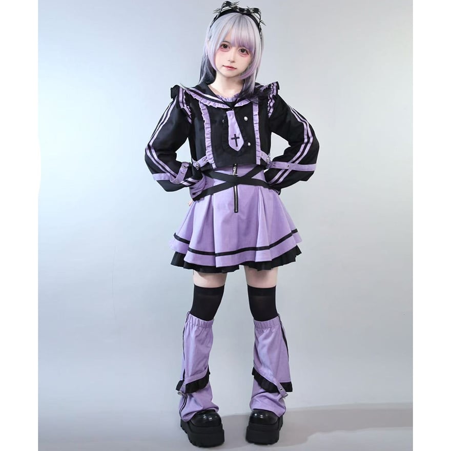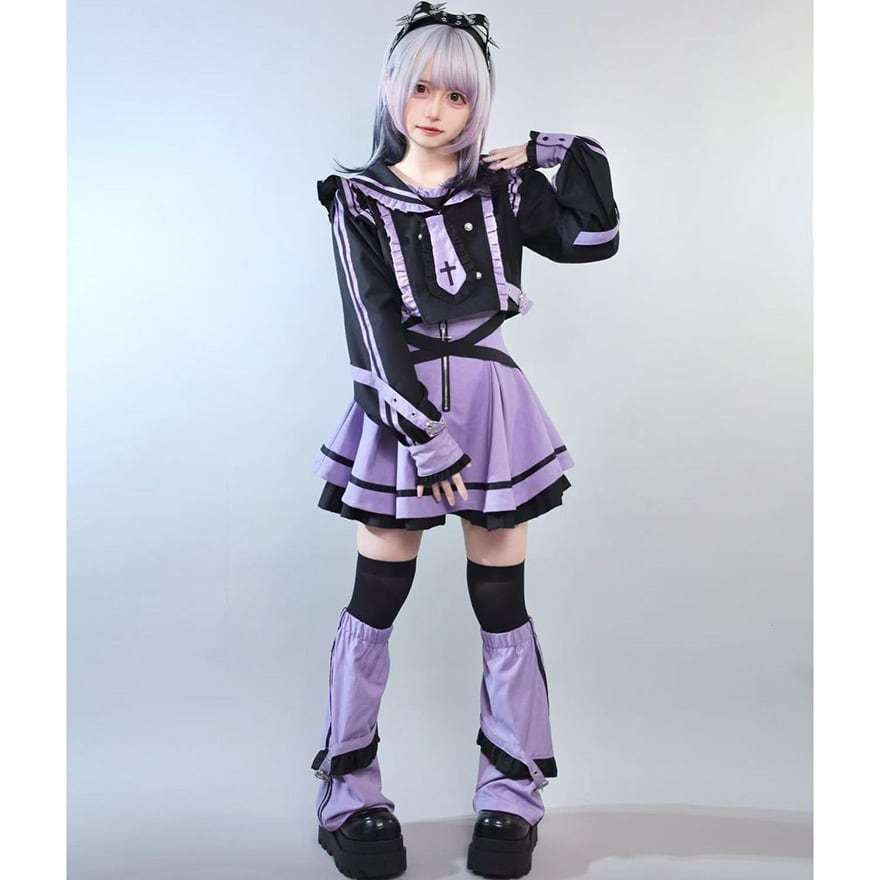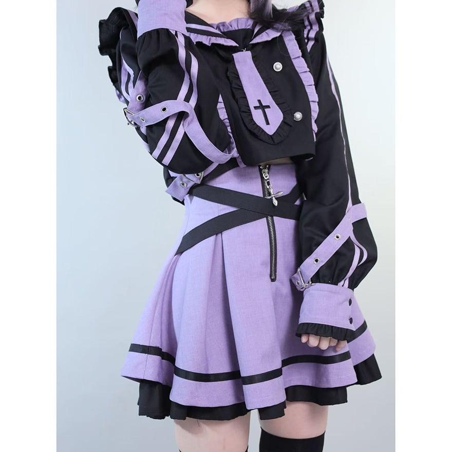 サブカル系ジャンルの象徴的な配色である紫色と黒色を基調とした、装飾性の高いセットアップです。