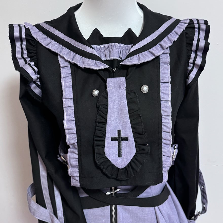 主な装飾として、フリル付きのセーラー襟、十字架の刺繍が入ったネクタイ、前面の銀色ボタン、スカートの交差する黒い装飾ベルトがあります。