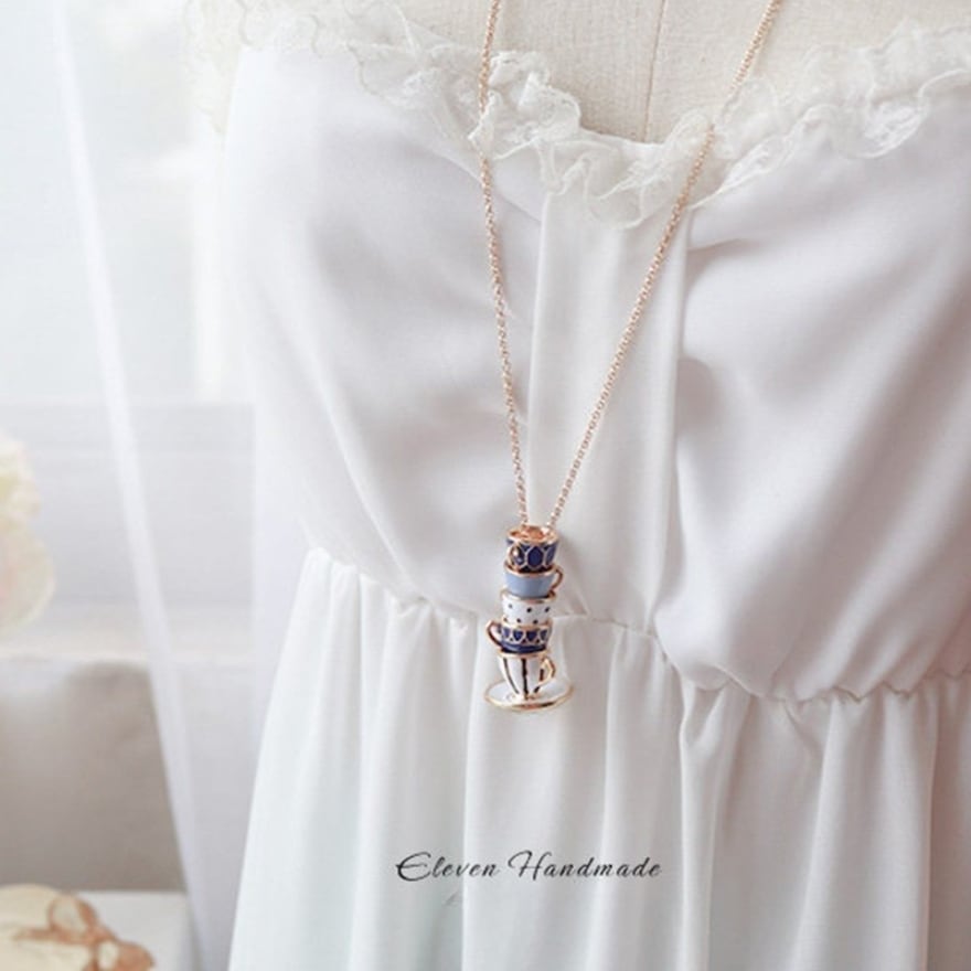 サブカル系ジャンルに属する、異なるデザインのティーカップを五客垂直に積み上げた独創的な造形のロングネックレスです。