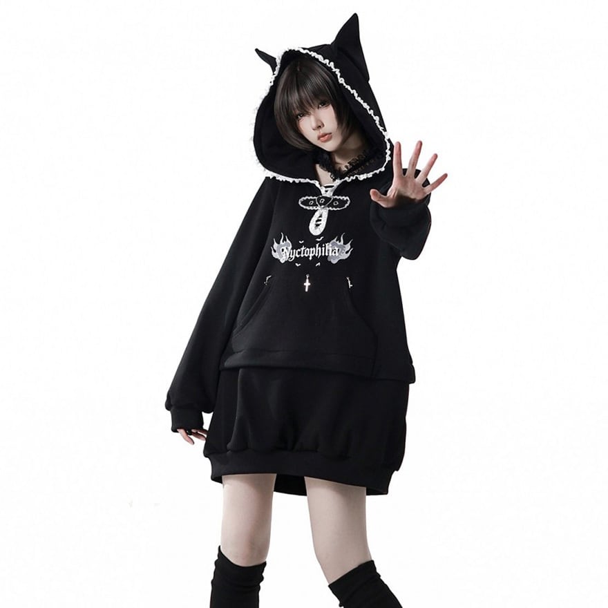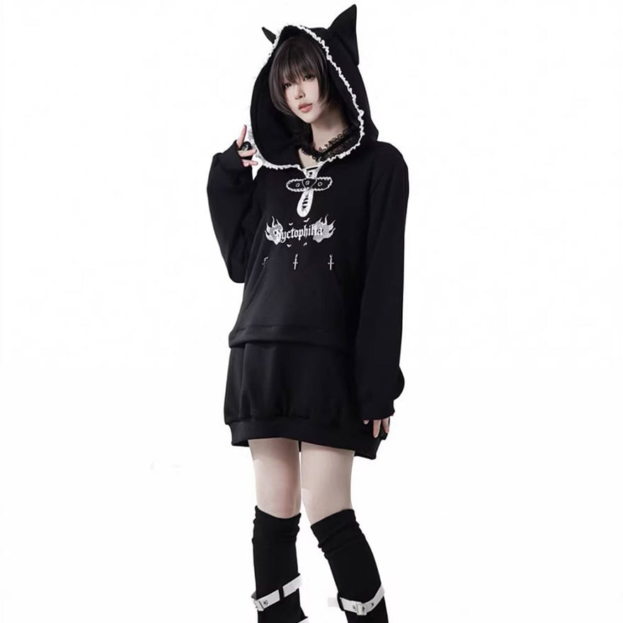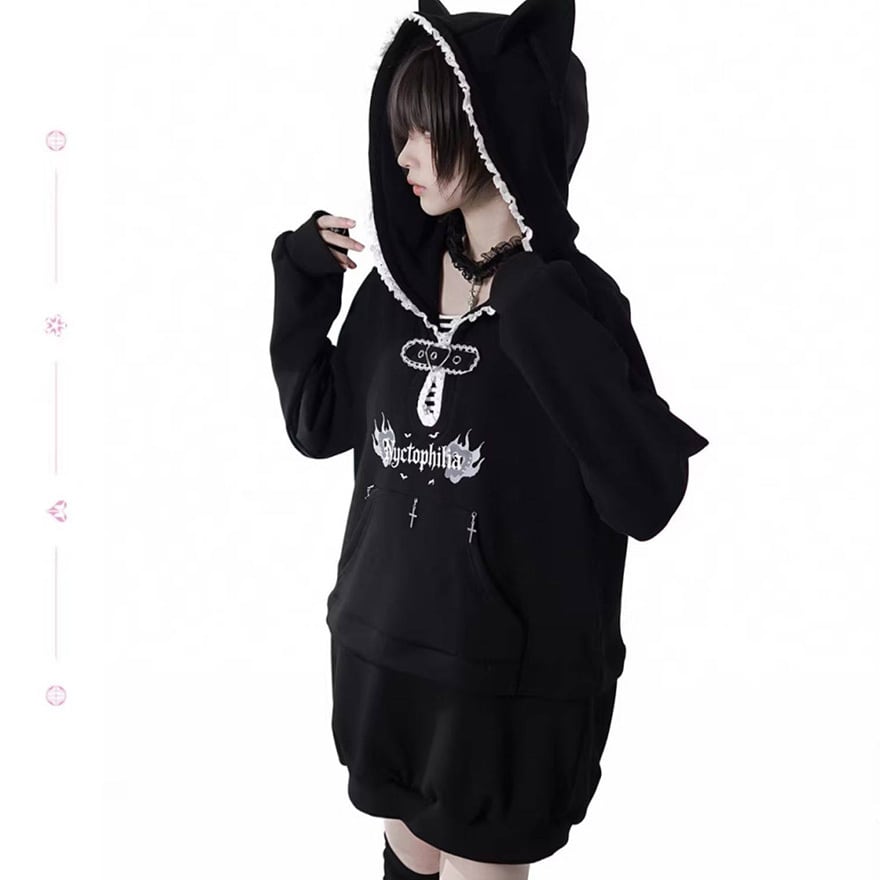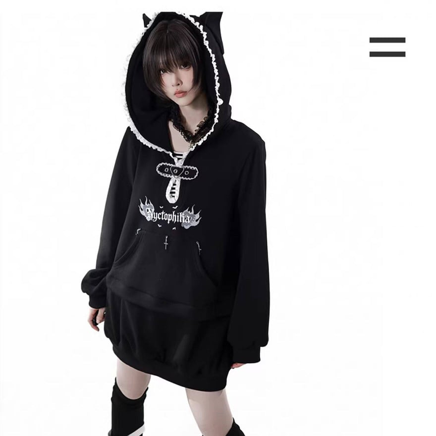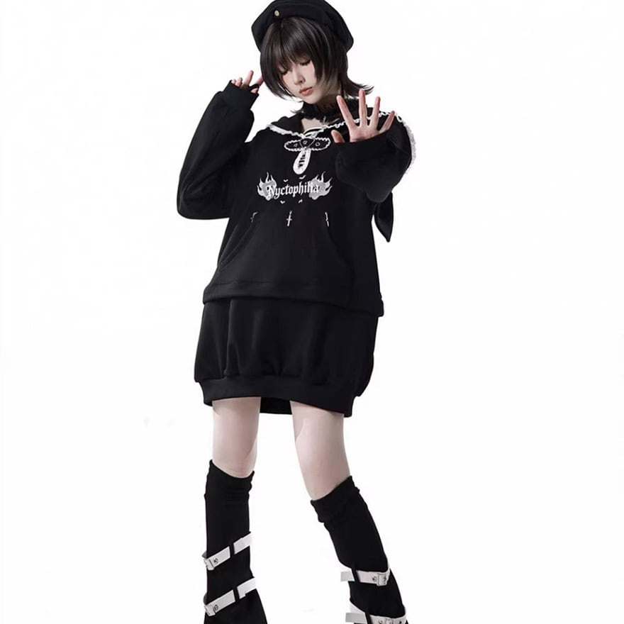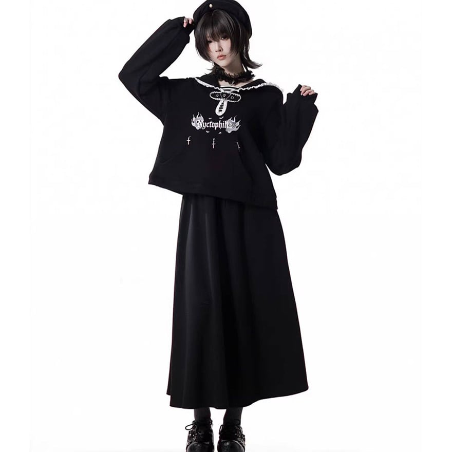 黒を基調とした配色と、ゆとりのあるドロップショルダーのシルエットにより、大人のサブカルスタイルとしても馴染みます。