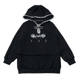 前面の中央には白色のレースで十字架の文様が形作られています。ファスナーの引き手には銀色の十字架型チャームが付属します。