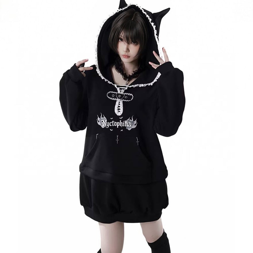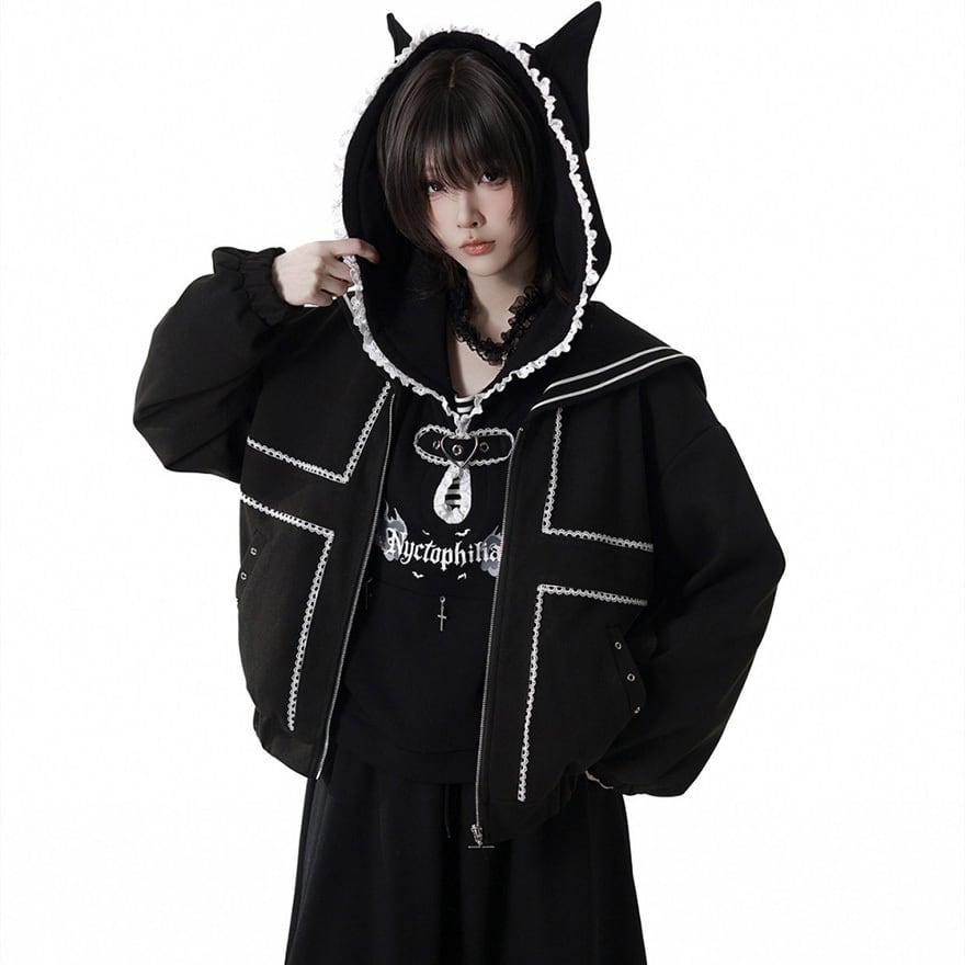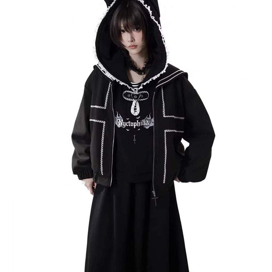 フードの縁や首元に白いレースをあしらい、胸元には英字ロゴのプリントと3つの銀色十字架チャームを配置しています。