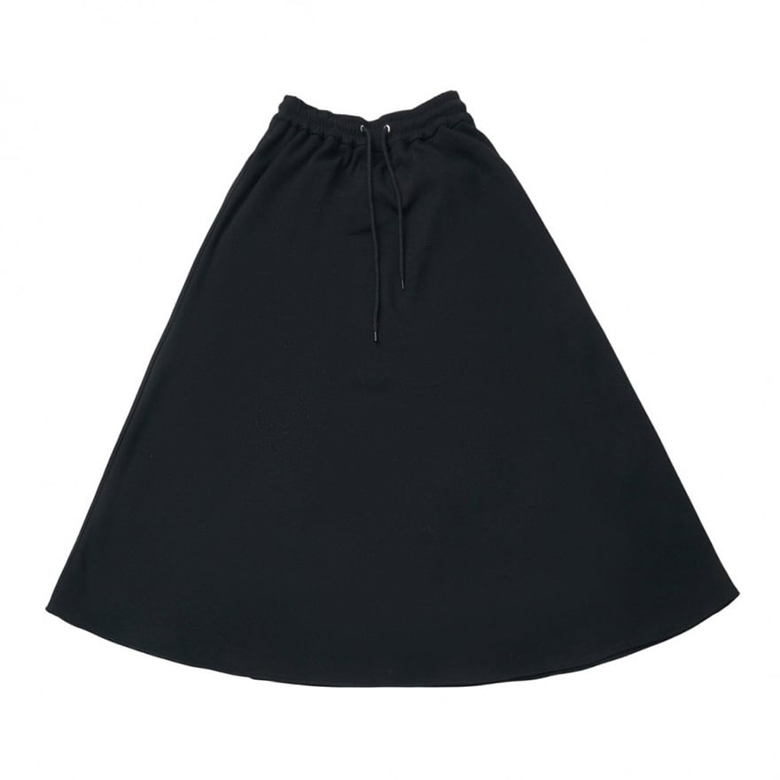 ブラック単色の無地デザインです。ウエストは伸縮性のあるゴムシャーリング仕様で、中央から調節用の紐が出ています。