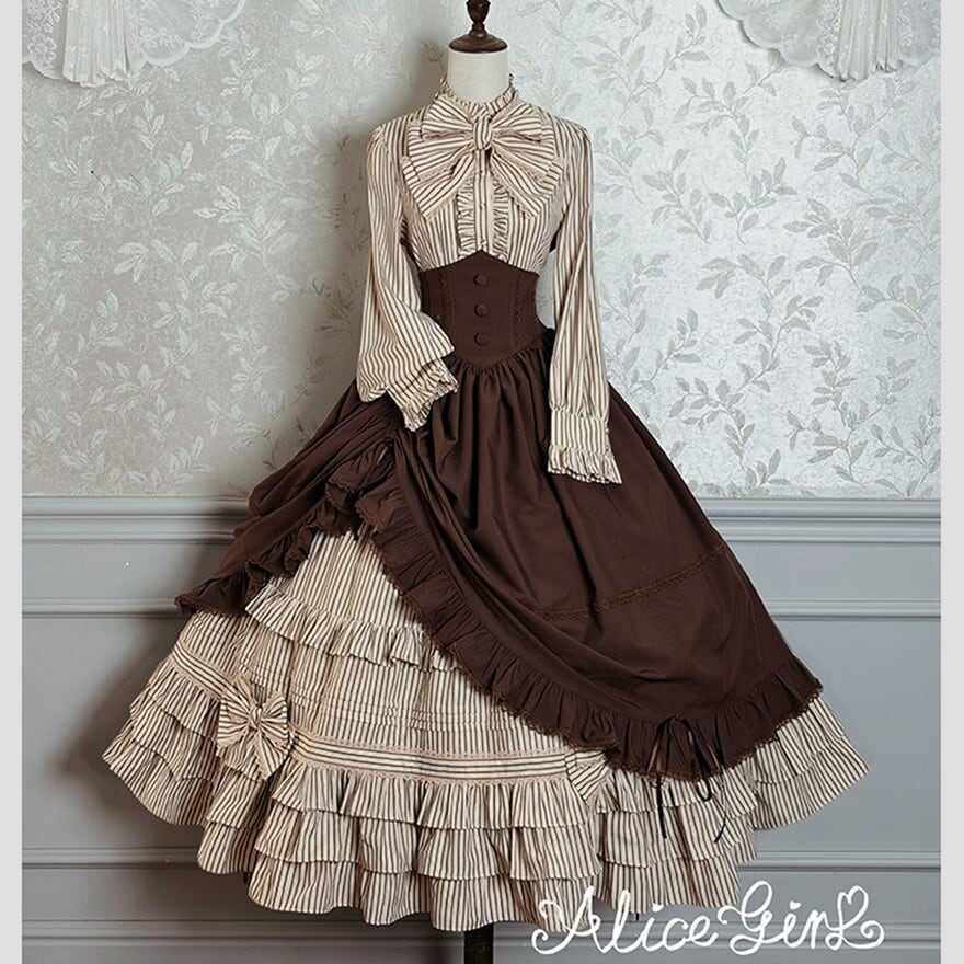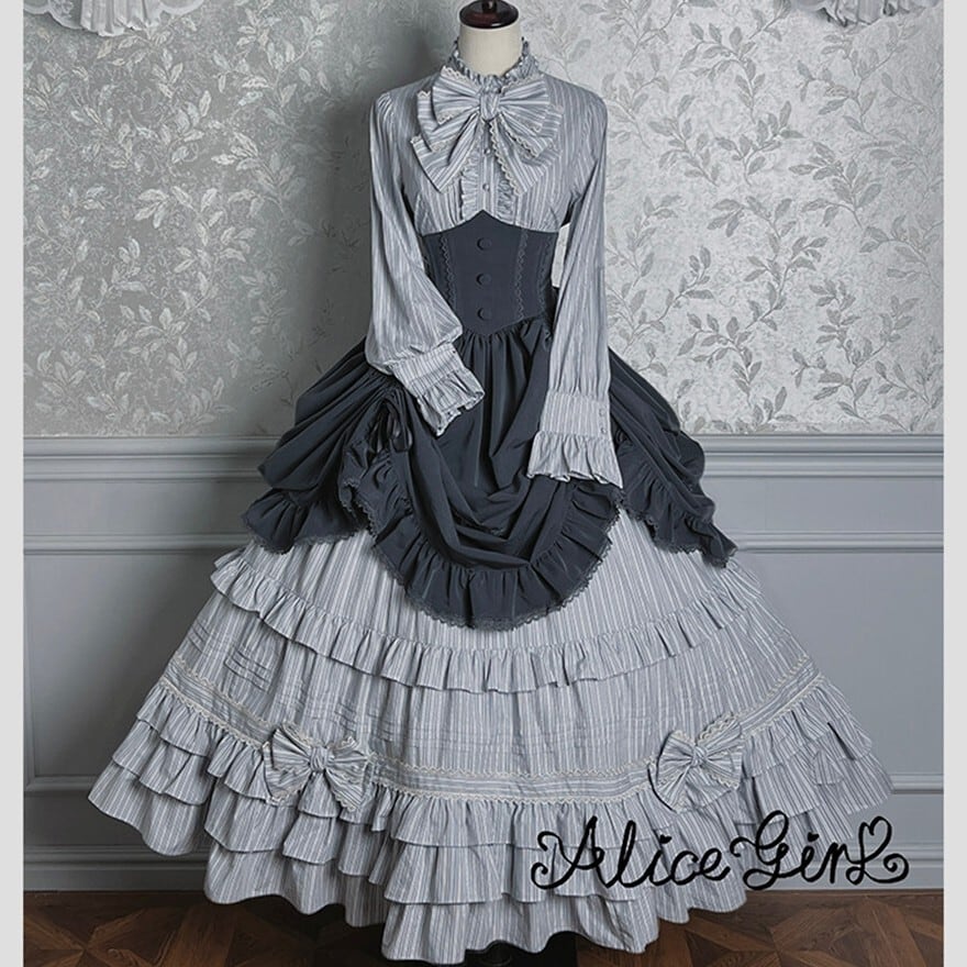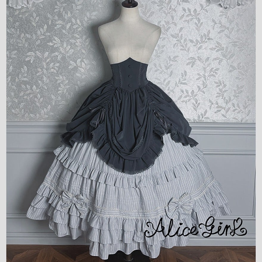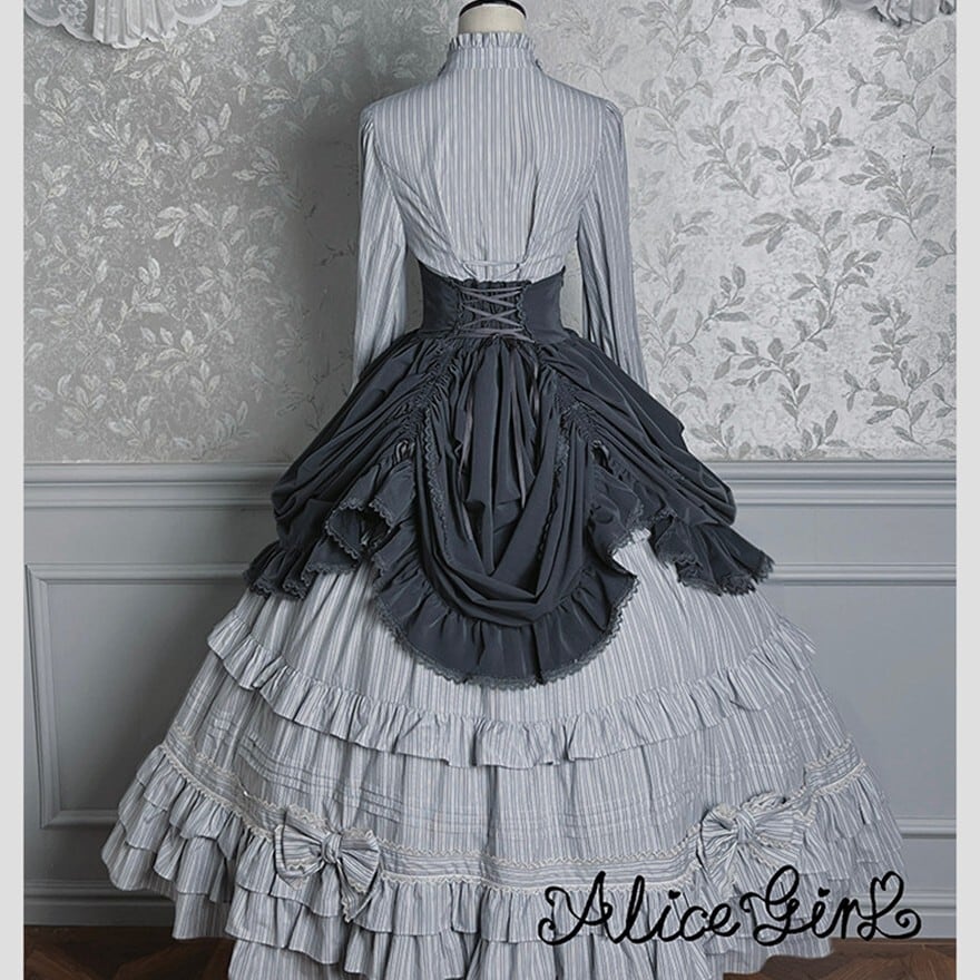 幾重にも重なるフリルが空気をはらみ、歩くたびに裾が静かに揺れる。ストライプが纏う端正な繊細さと、コルセットが生み出す凛としたシルエット――どちらを選んでも、物語の一場面に迷い込んだような存在感を纏えます。