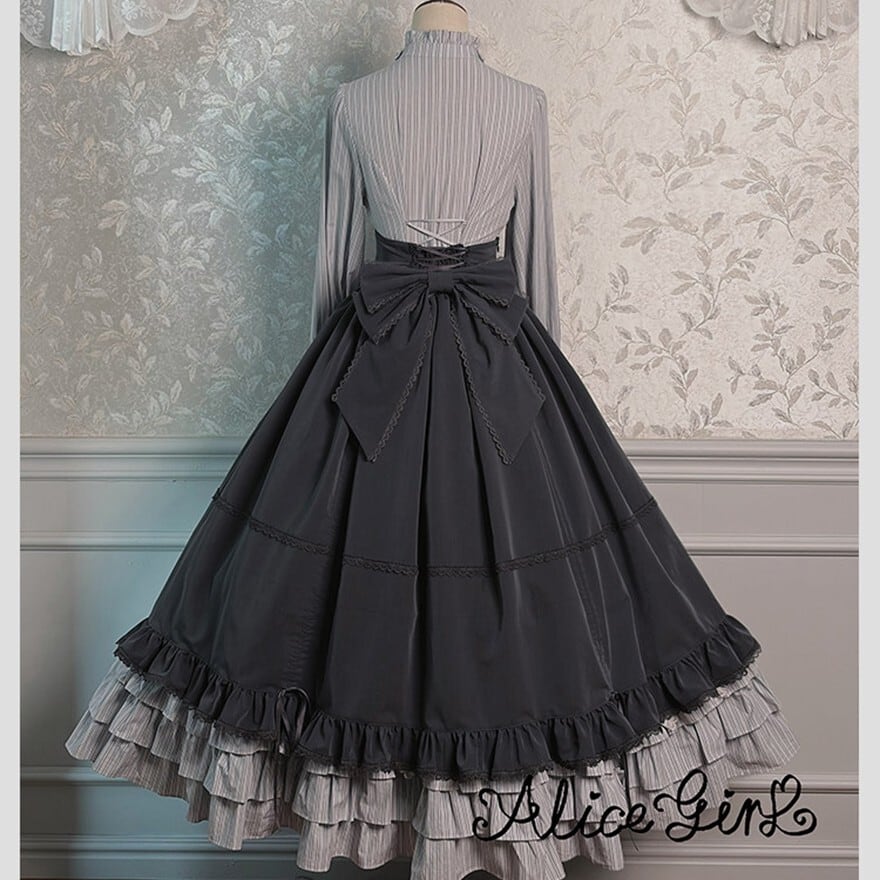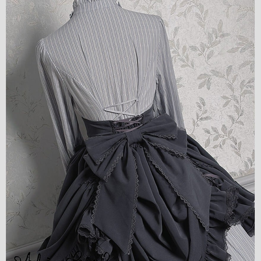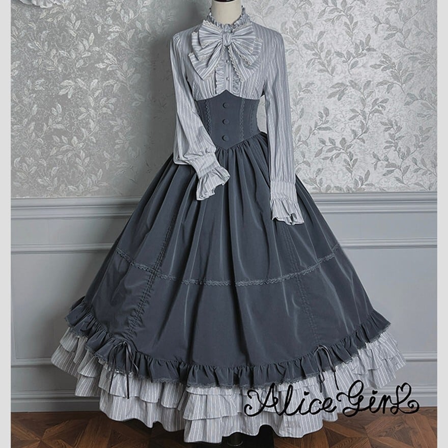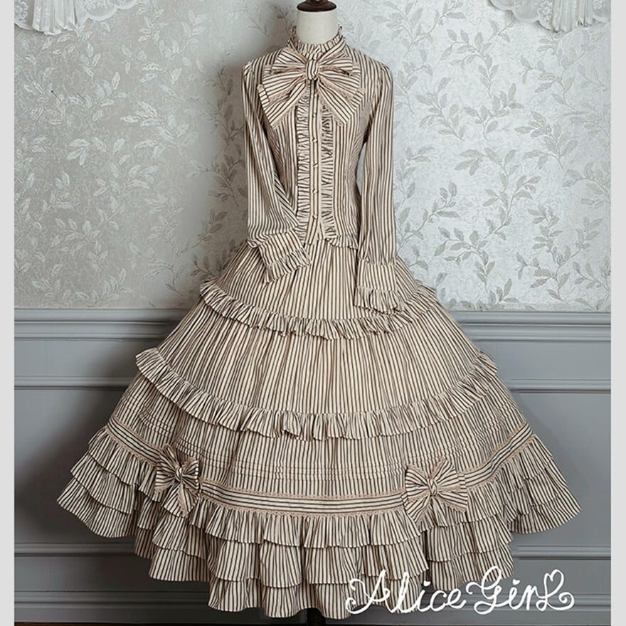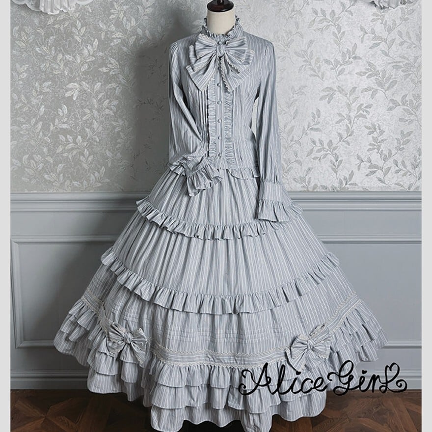 幾重にも重なるフリルが空気をはらみ、歩くたびに裾が静かに揺れる。ストライプが纏う端正な繊細さと、コルセットが生み出す凛としたシルエット――どちらを選んでも、物語の一場面に迷い込んだような存在感を纏えます。