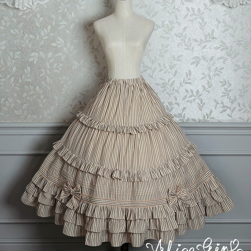 ALICE GIRL新作のヴィクトリアン調スカートは、多段フリルのストライプタイプとコルセットウエストの無地タイプ、合計4カラー展開で、撮影会やゴシックイベントに映えるクラシカルなシルエットが特徴です。前回のフルセットと同シリーズのアイテムで、セットとの組み合わせや単品での着回しにも対応します。