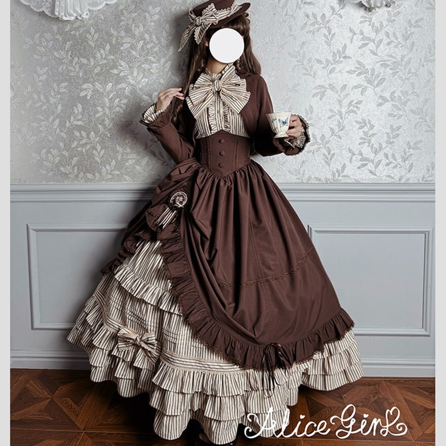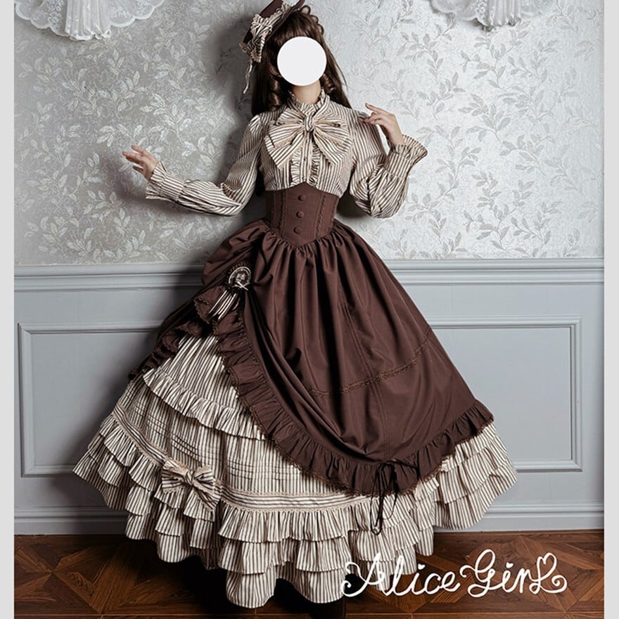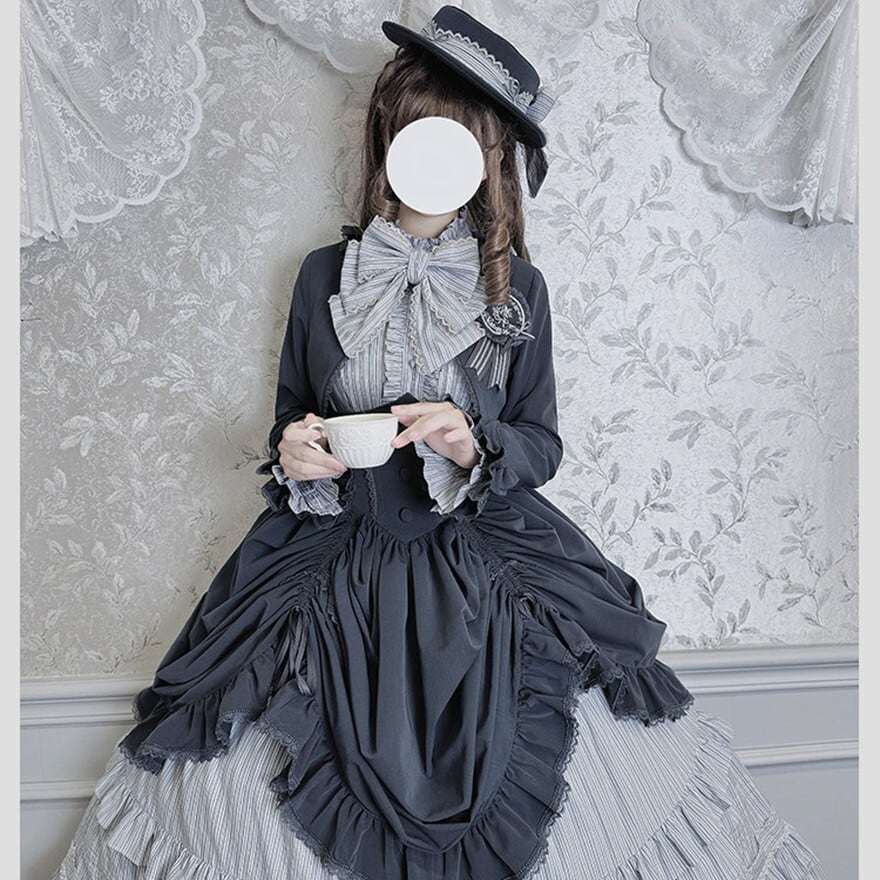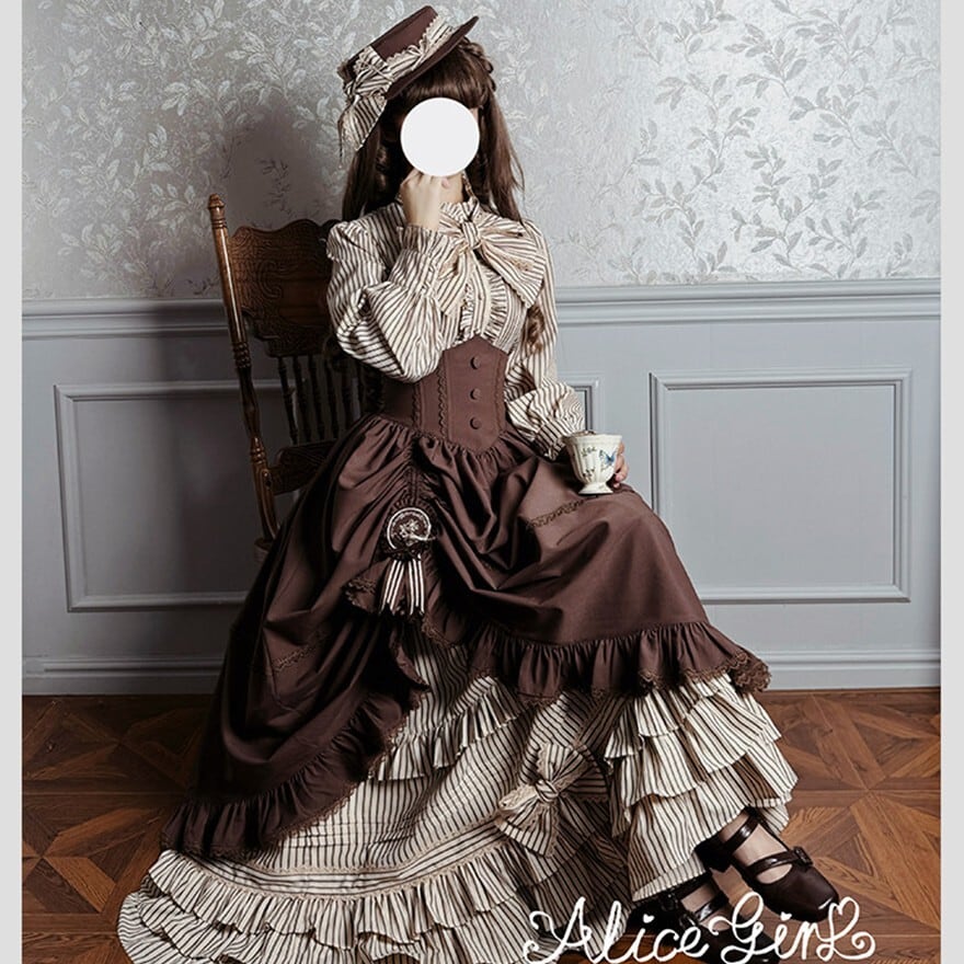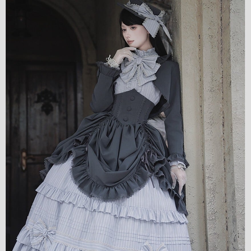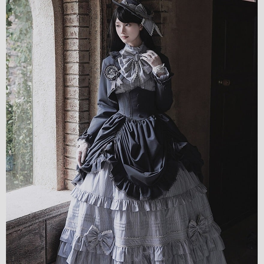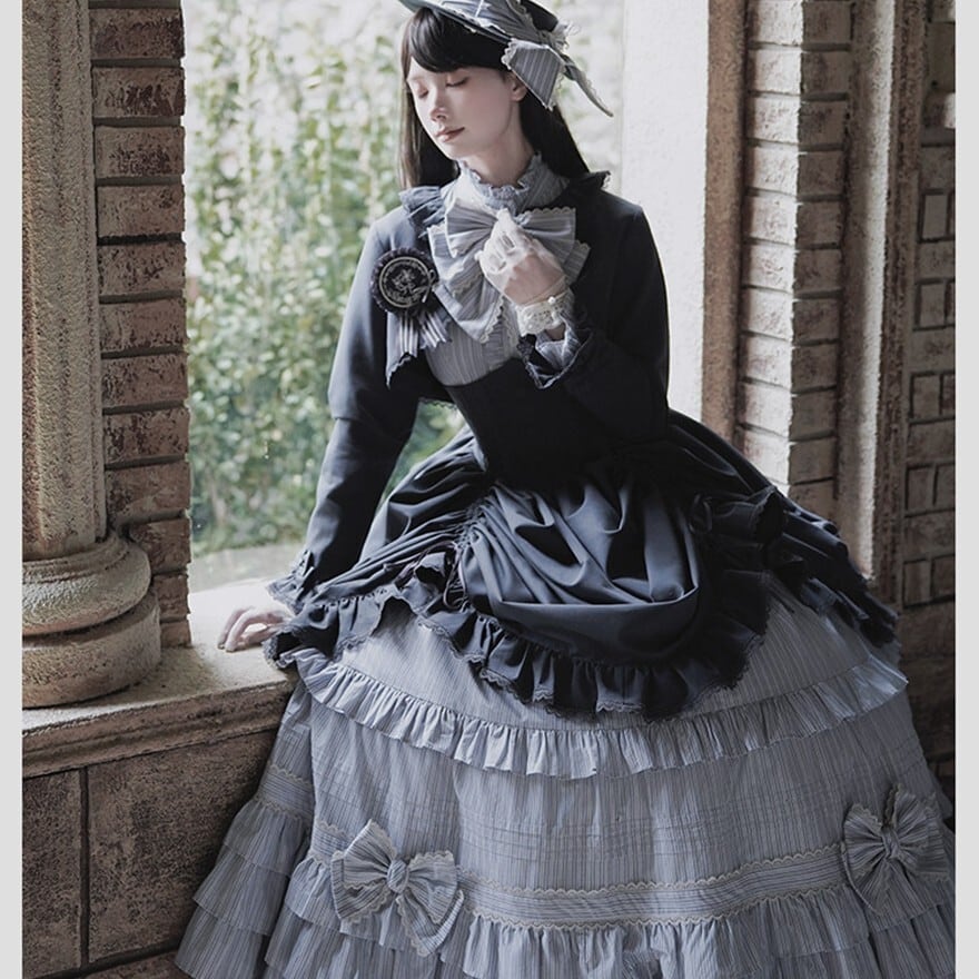 ALICE GIRL新作の6点フルセットは、黒×グレーストライプと多段フリルを重ねたヴィクトリアン調の構成で、撮影会やゴシックイベントにそのまま臨める完結型セットアップです。
