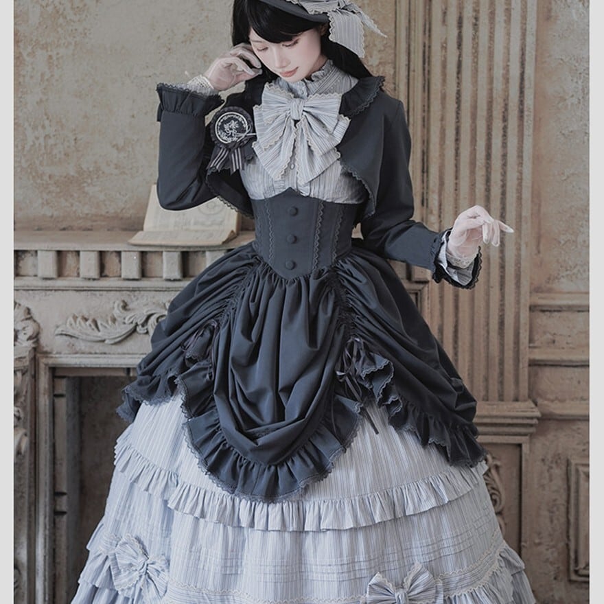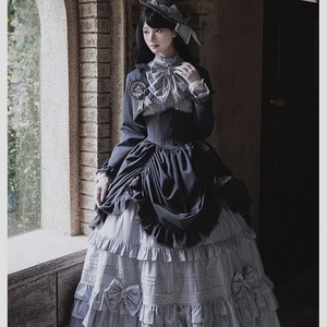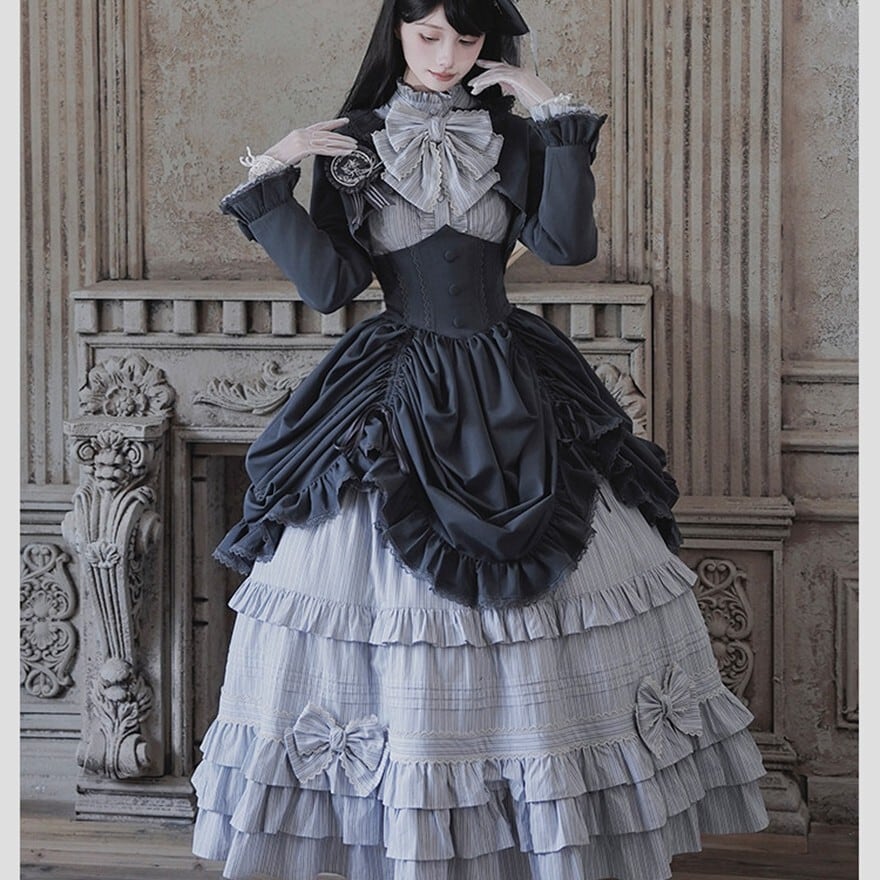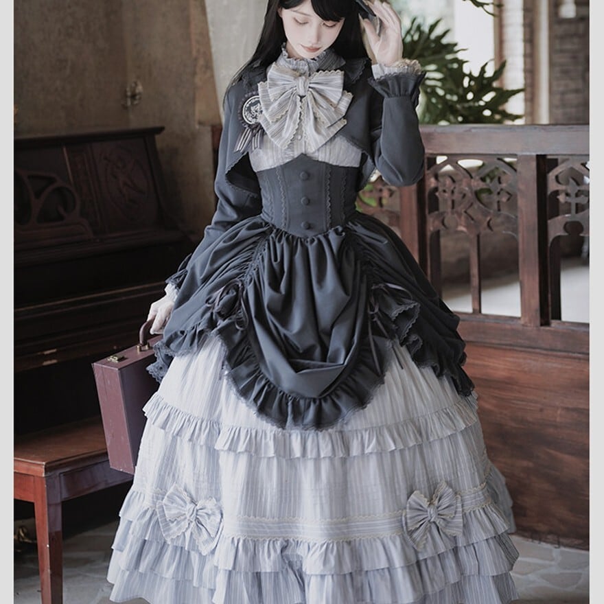 物語の令嬢へ ゴスロリ多段フリル6点フルセット ブラック×グレー|WithU