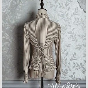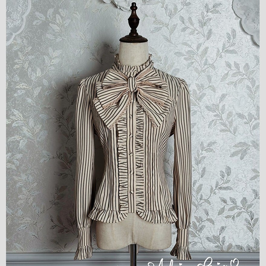 ・ブラウス:ストライプ柄・立て衿・大きなリボンジャボ・レース袖口