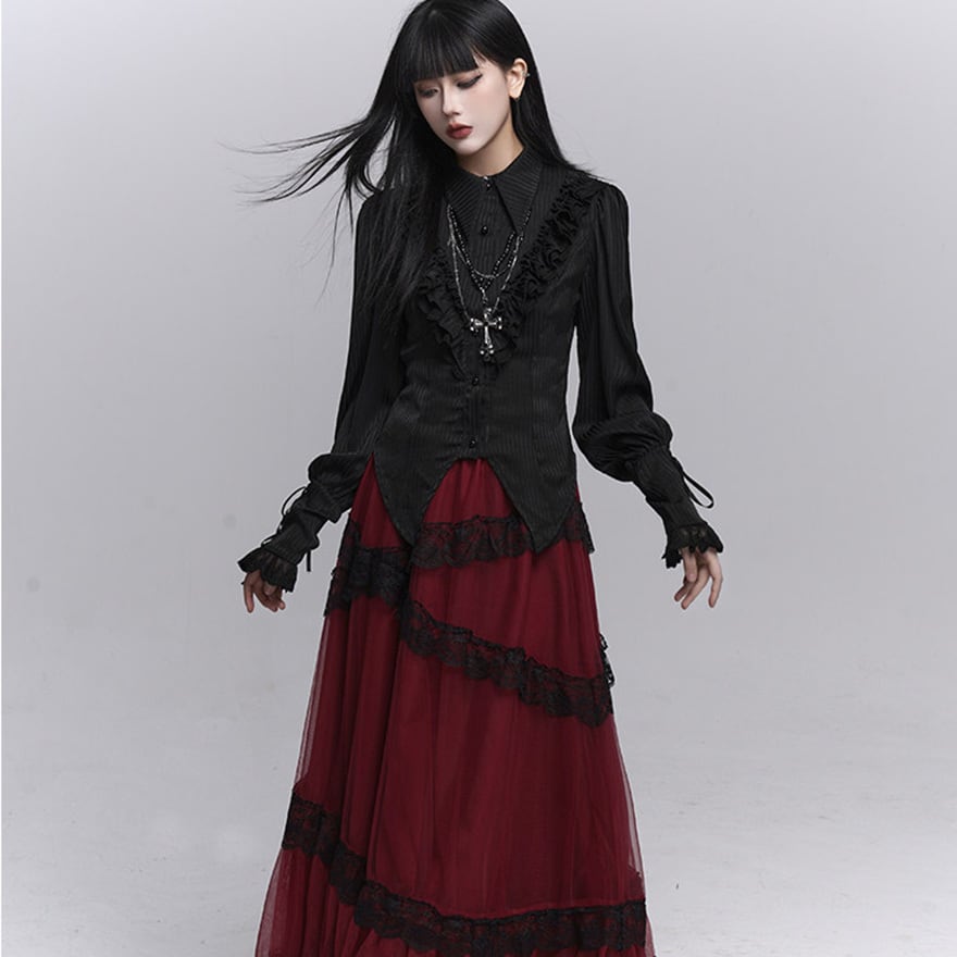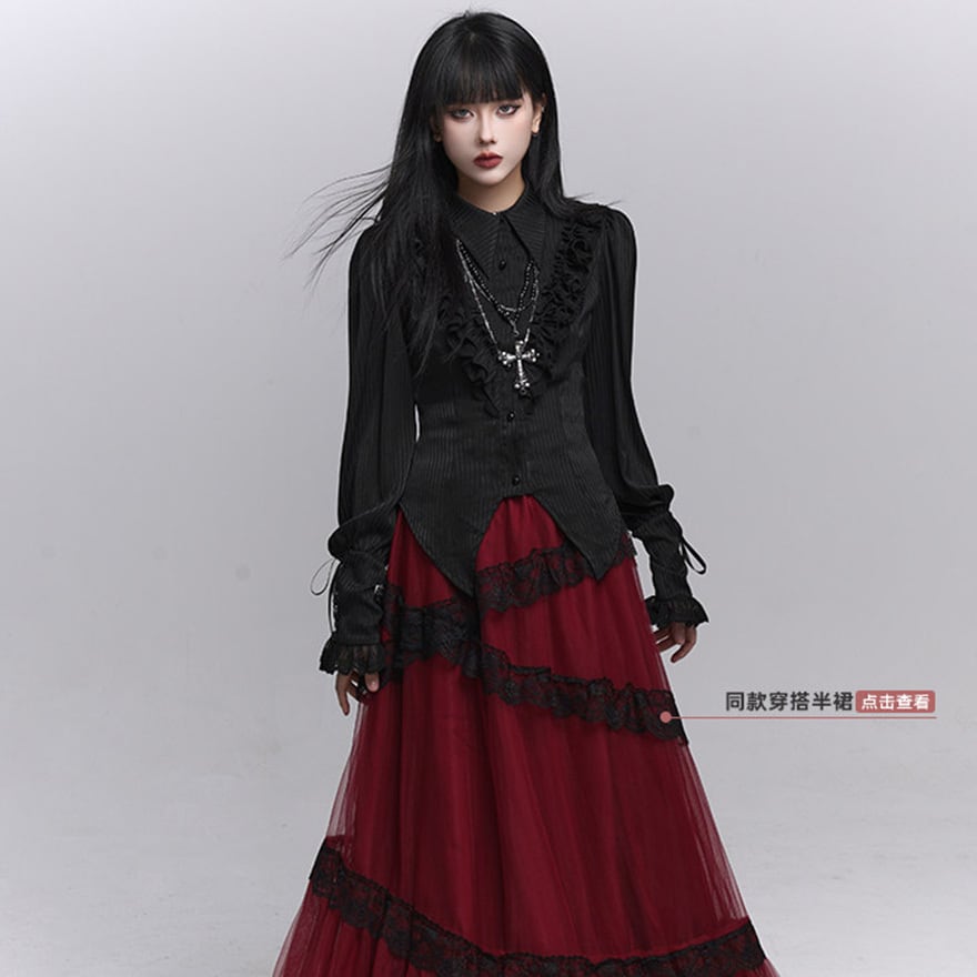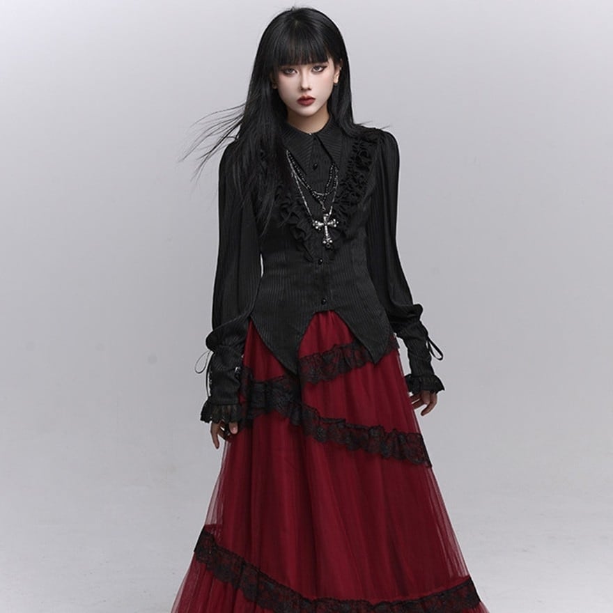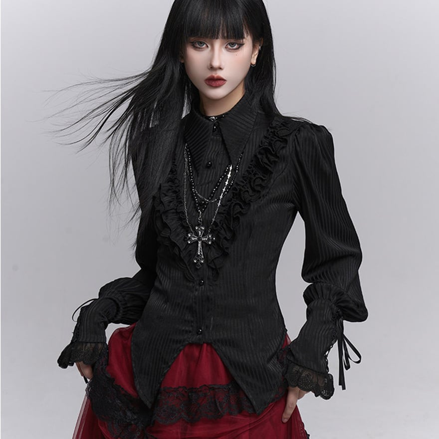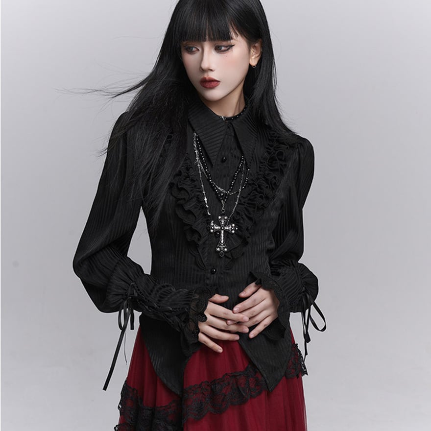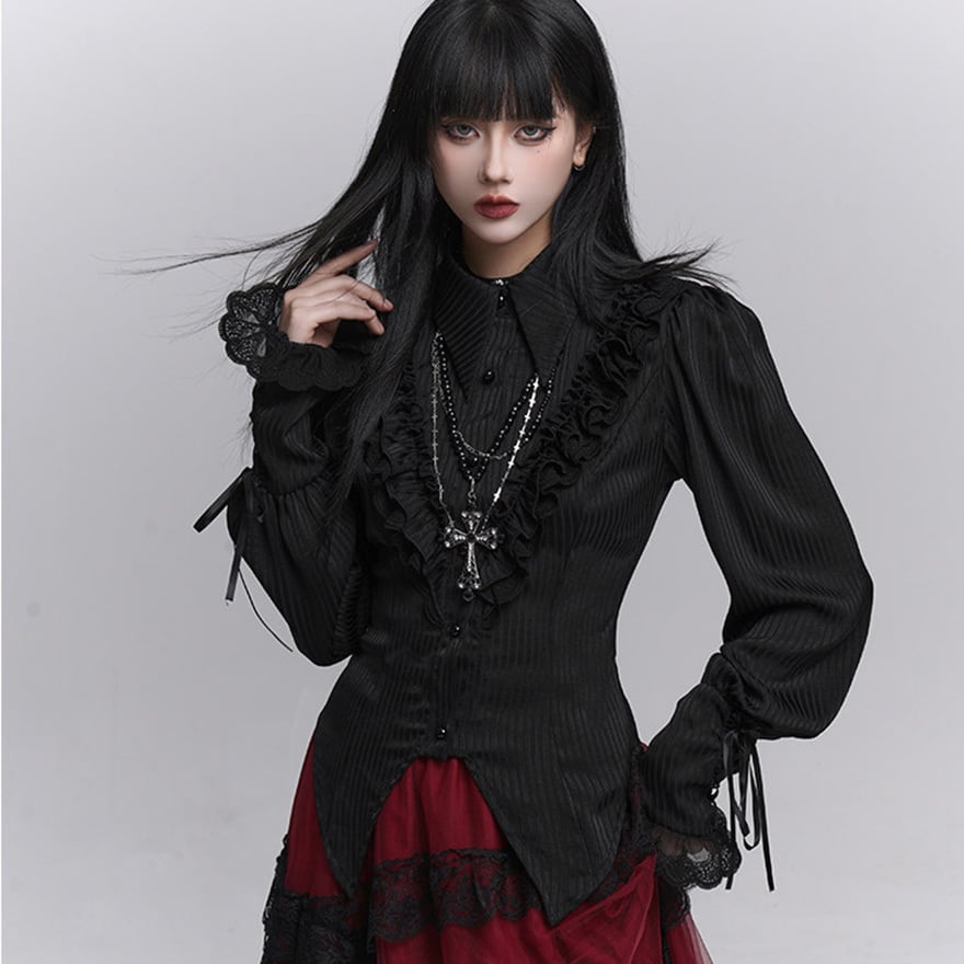 繊細なフリル装飾と縦ラインを強調したシルエットが特徴で、退廃的で上品なゴシックコーデを完成させたい方に最適です。ブラックで統一されたデザインが、甘さを抑えつつ気品ある印象を演出します。