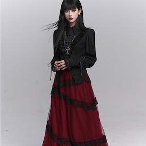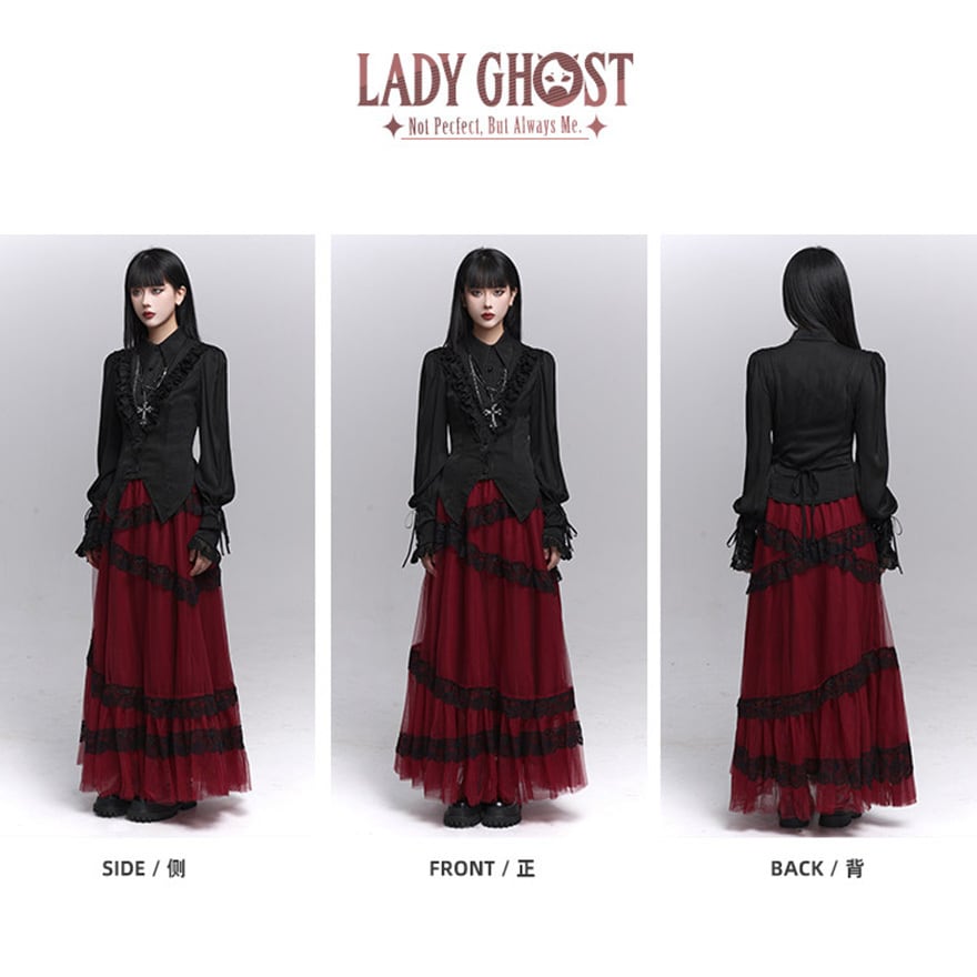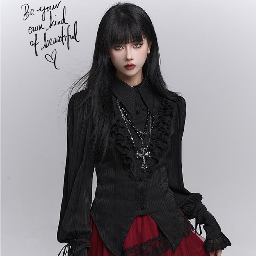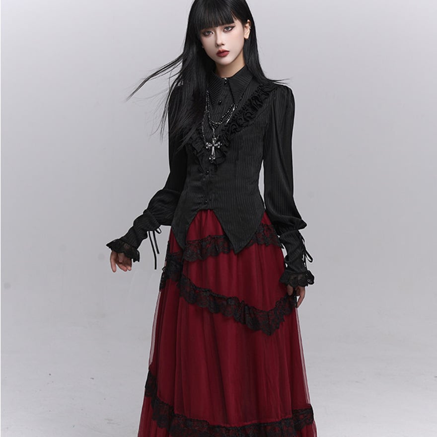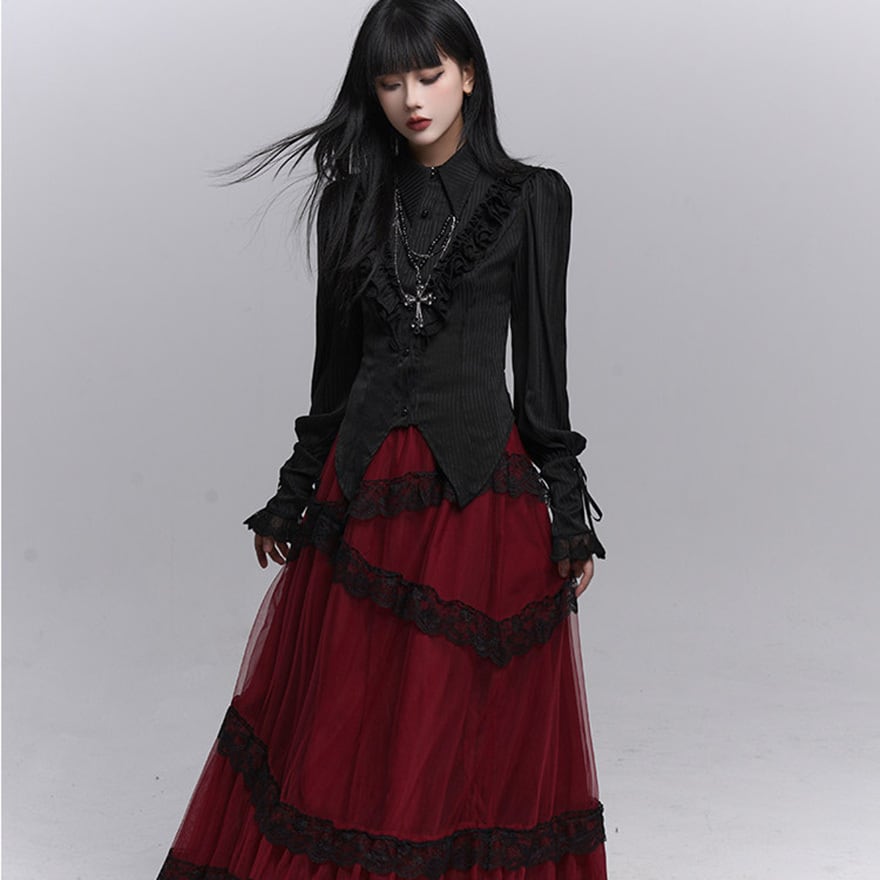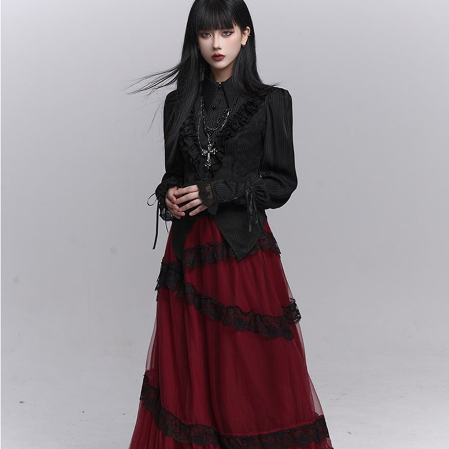 繊細なフリル装飾と縦ラインを強調したシルエットが特徴で、退廃的で上品なゴシックコーデを完成させたい方に最適です。ブラックで統一されたデザインが、甘さを抑えつつ気品ある印象を演出します。