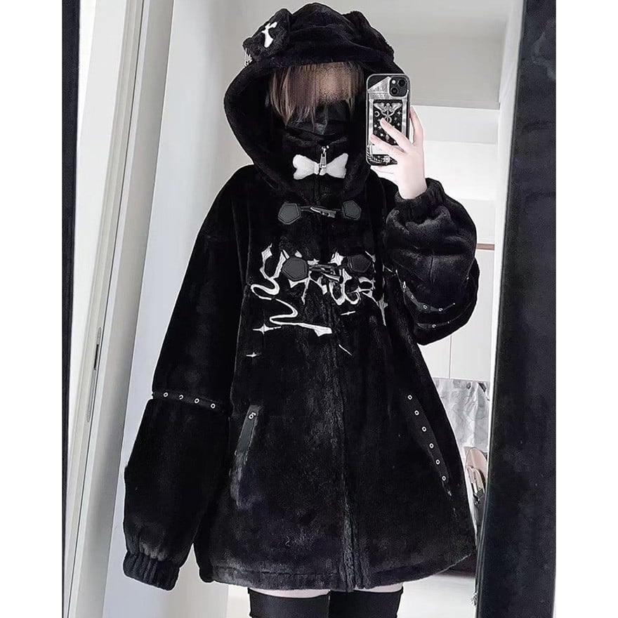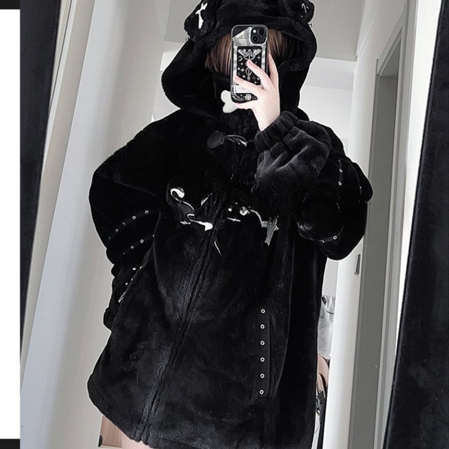 オーバーサイズのシルエットのボア生地に白いグラフィックプリントとバックル装飾を施し、フードには耳の意匠があしらわれています。