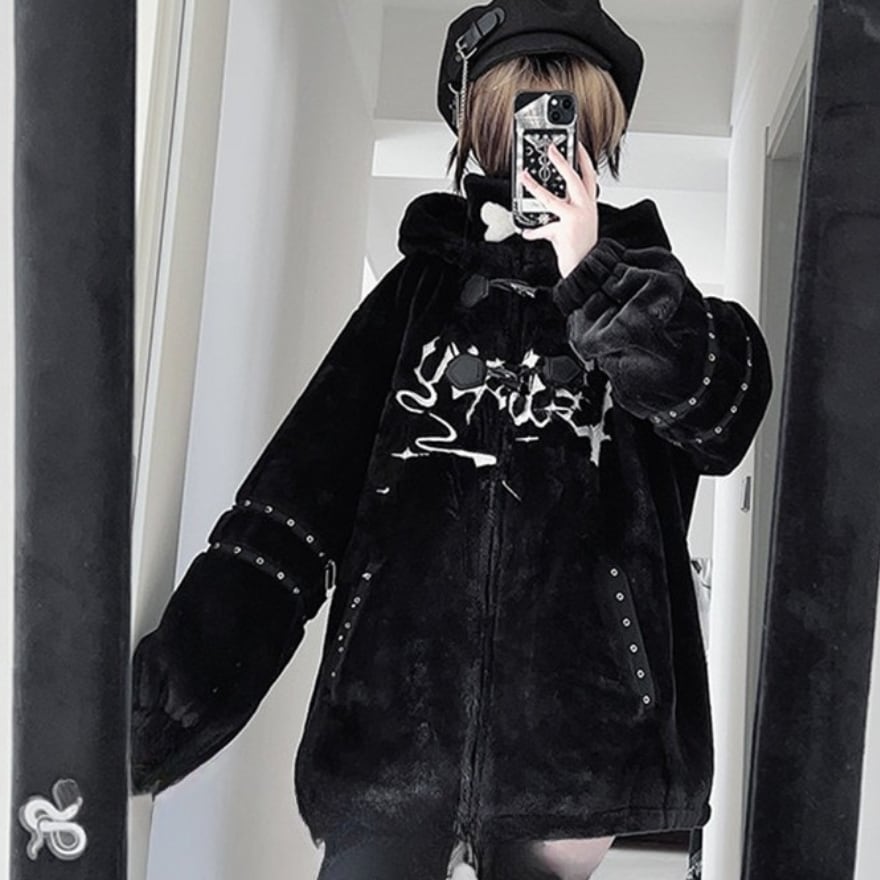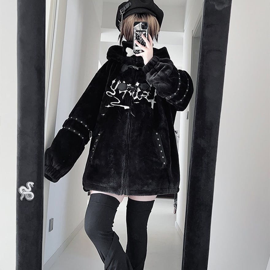 黒色のボア素材を全面に使用。胸元に白い抽象的なグラフィックプリント、袖やポケット部分にはアイレット(ハトメ)付きのストラップ装飾が配置されています。
