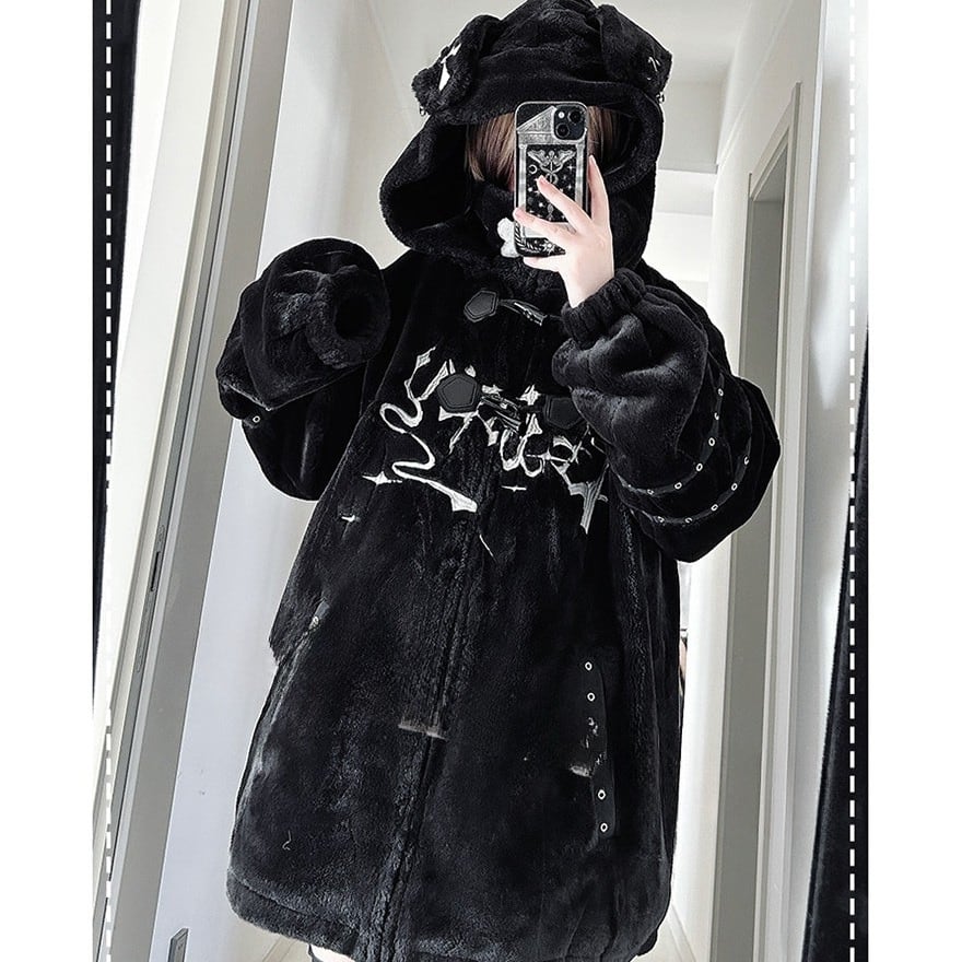 前面はジッパーに加え、トグルボタン風のバックルで留める構造です。フードには耳の装飾があり、全体的に肉厚な質感です。