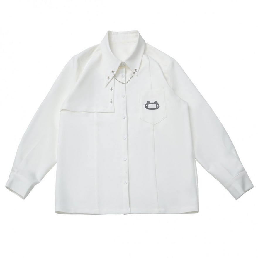 銀色の装飾チェーンが襟元を飾り、右胸にはアシンメトリーな重ね布が配置され、左胸ポケットには小型ゲーム機を模した刺繍が施されています。