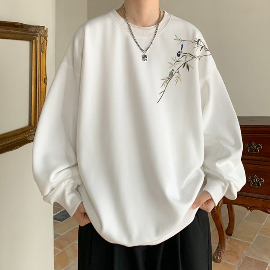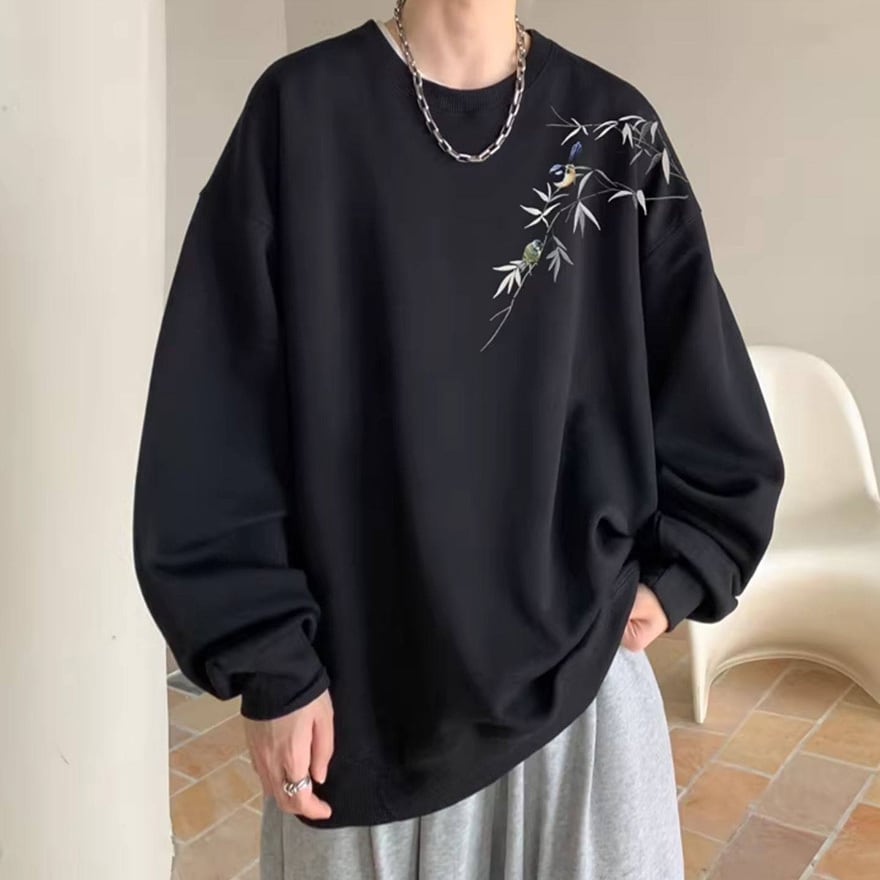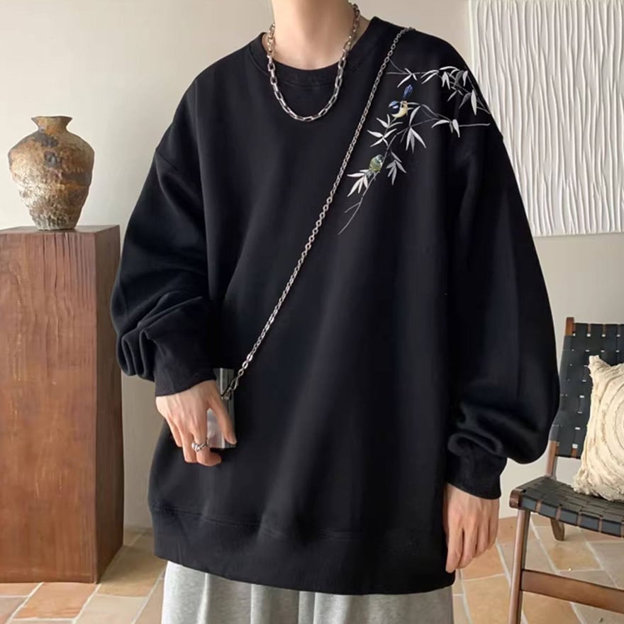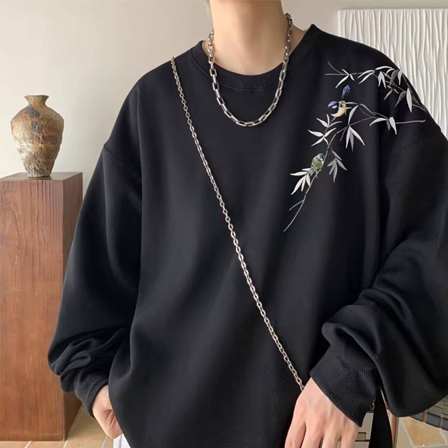 ゴスロリ系 静寂を纏う。笹と小鳥の刺繍オーバーサイズスウェット|中華×サブカル ユニセックストップス|WithU