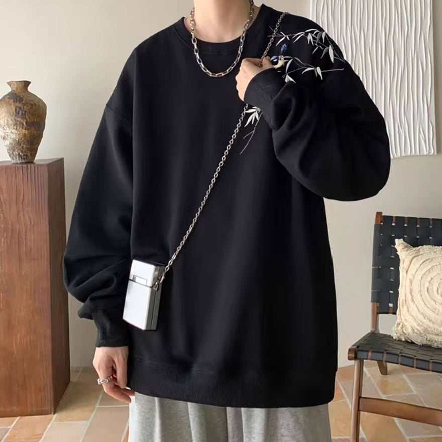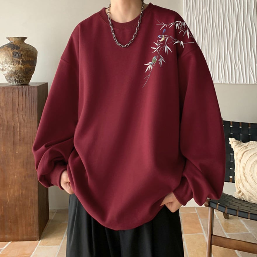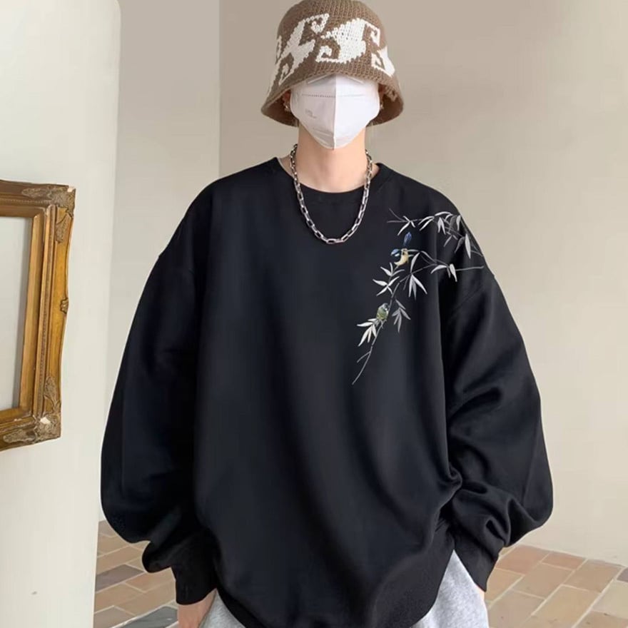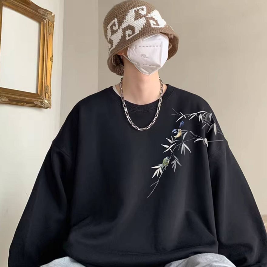 ゴスロリ系 静寂を纏う。笹と小鳥の刺繍オーバーサイズスウェット|中華×サブカル ユニセックストップス|WithU