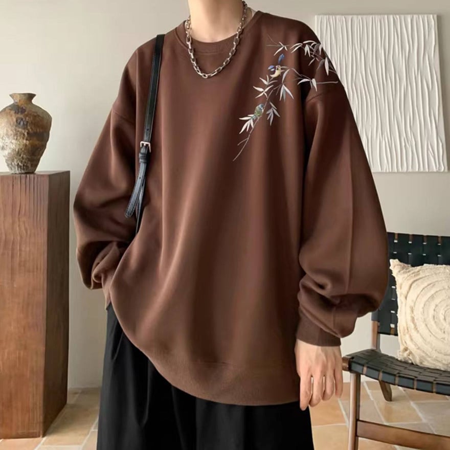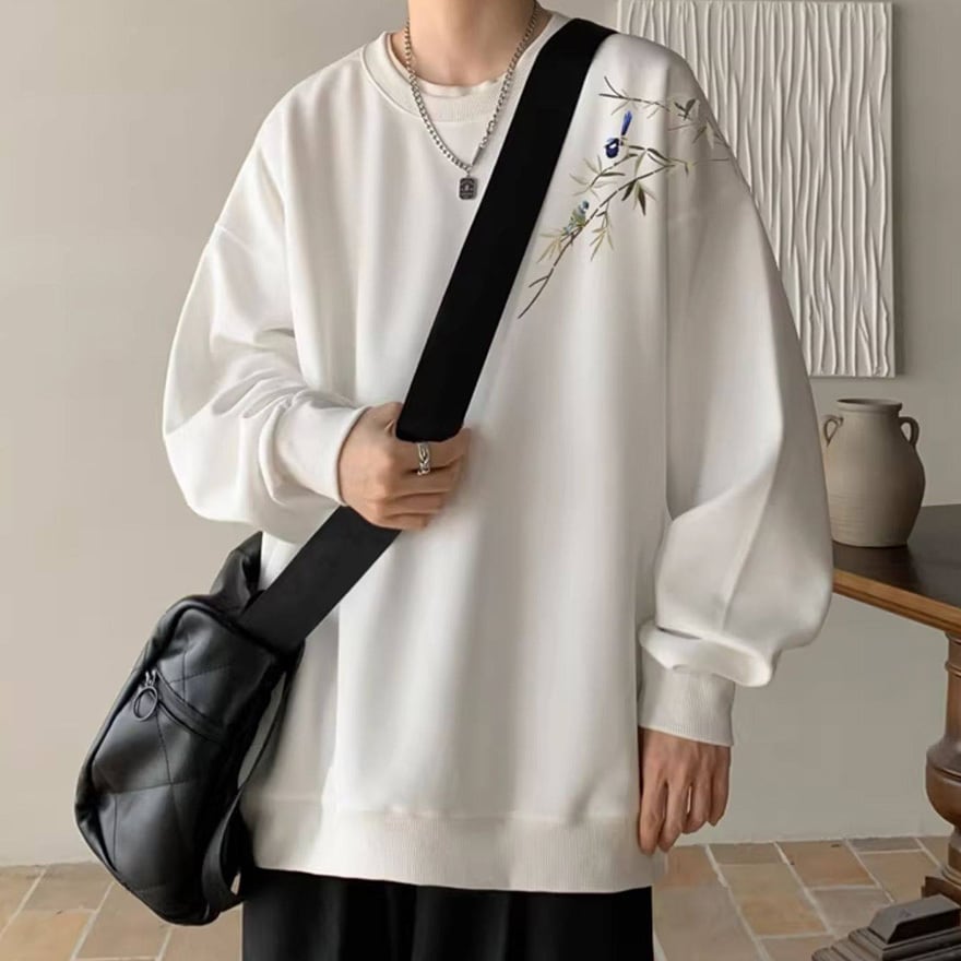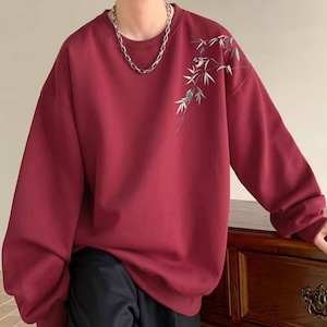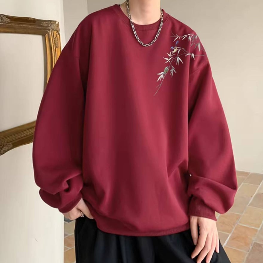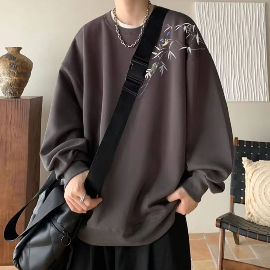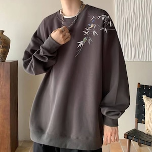 サブカル系ジャンルのオーバーサイズ長袖スウェットです。左肩から胸元にかけて施された、笹の葉と小鳥の繊細な刺繍がデザインの大きな特徴です。