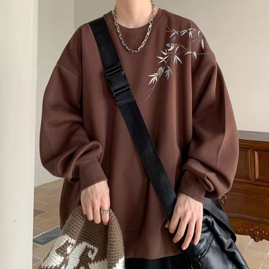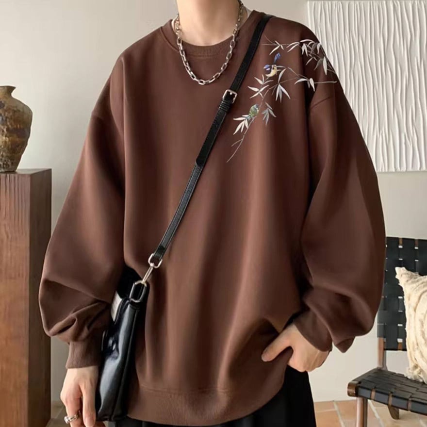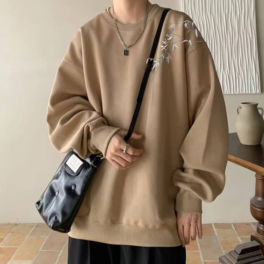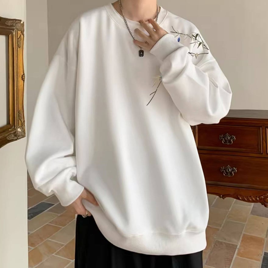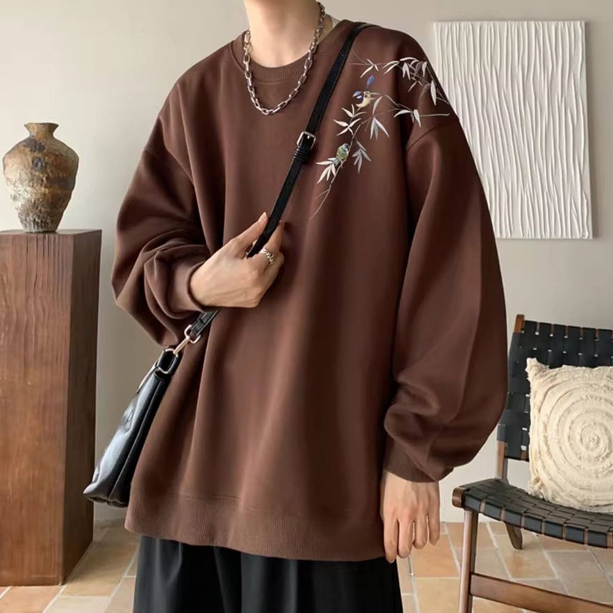 サブカル系ジャンルのオーバーサイズ長袖スウェットです。左肩から胸元にかけて施された、笹の葉と小鳥の繊細な刺繍がデザインの大きな特徴です。