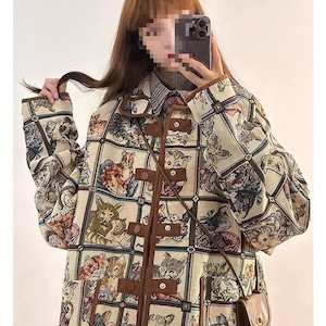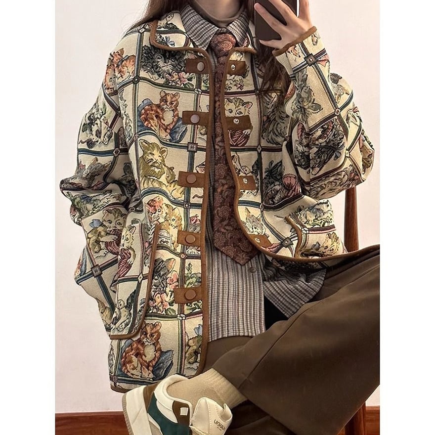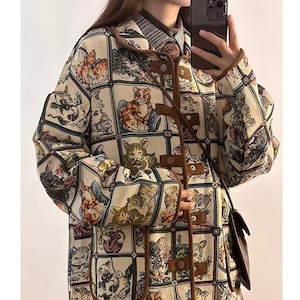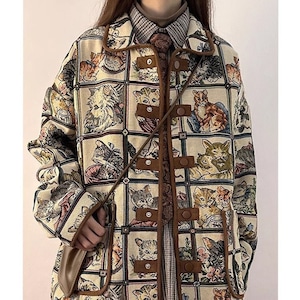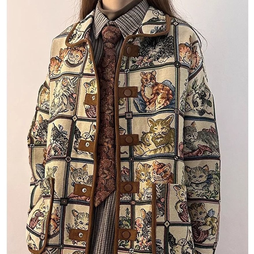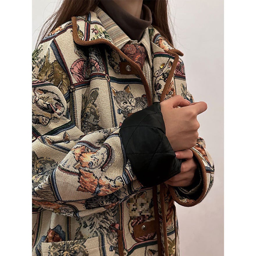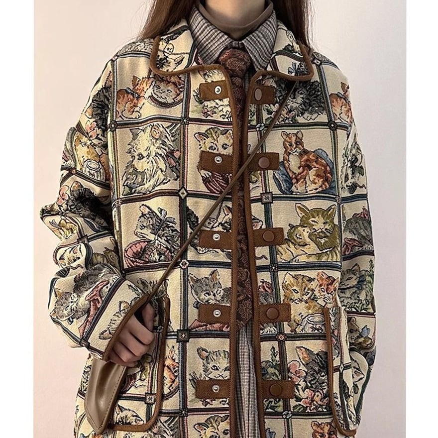 猫柄のゴブラン風生地と格子デザインが特徴で、レトロクラシカルなコーデに最適です。温もりある配色と繊細な柄表現が、落ち着いた個性を演出。羽織るだけで物語性のあるスタイルを完成させる主役級アウターです。