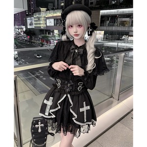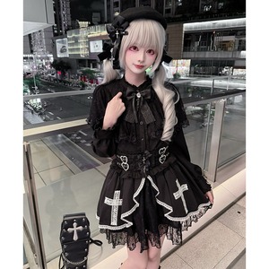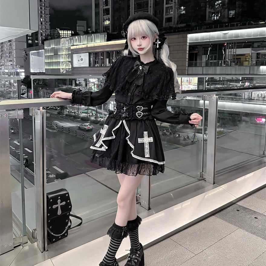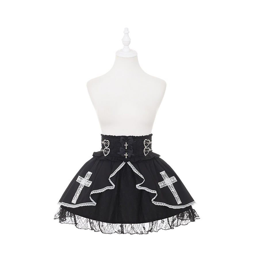十字架レース装飾とコルセット風ウエストが特徴で、撮影会やゴシックロリータコーデに最適です。ブラックベースにホワイトレースが映え、視線を引きつけるデザイン。ウエストの構造がシルエットを引き締め、1枚で完成度の高いスタイリングを実現します。