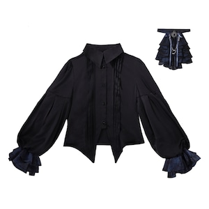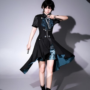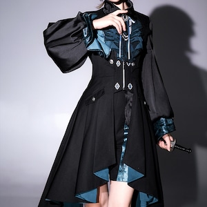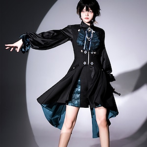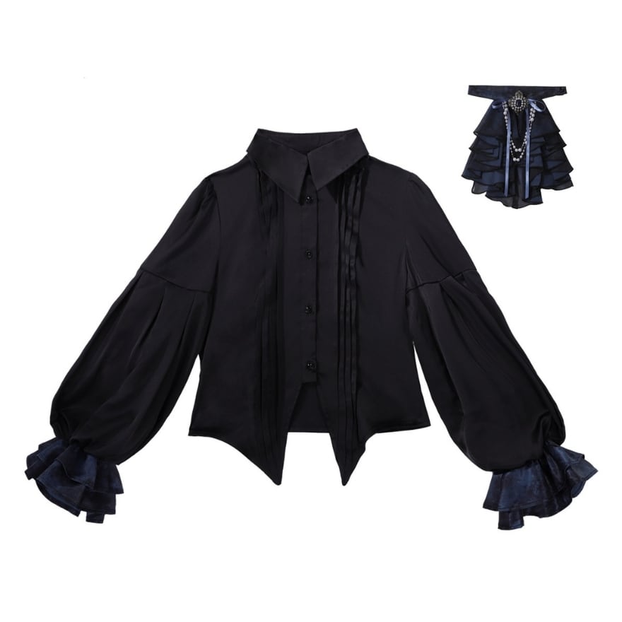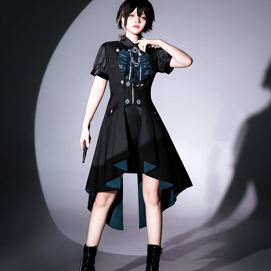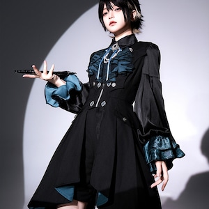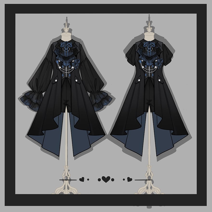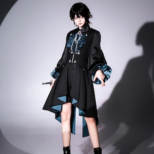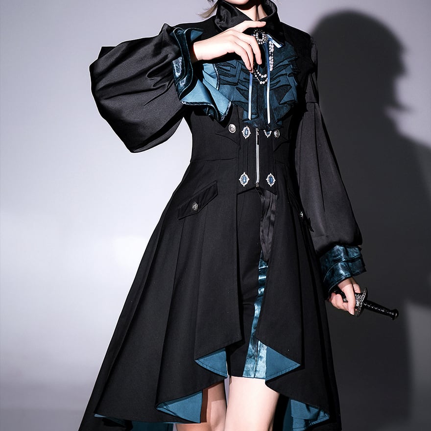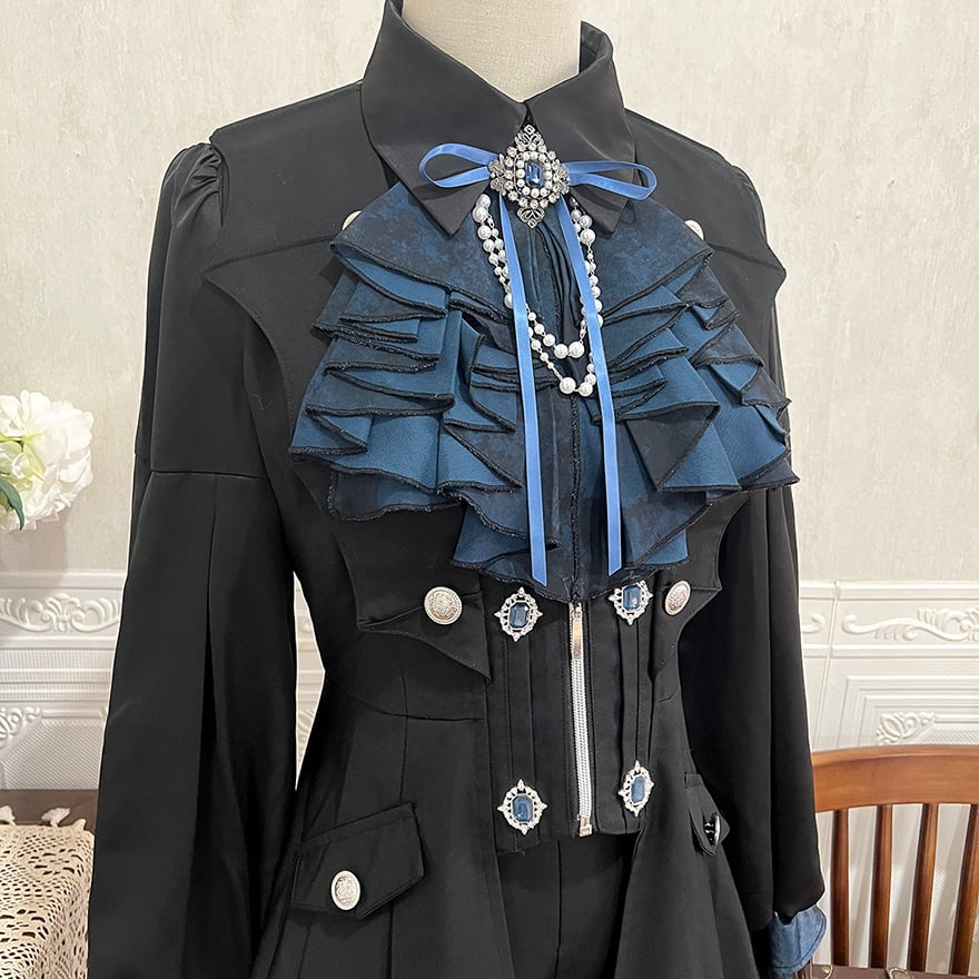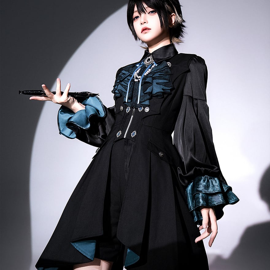 麗人 男装 セットアップ 王子系 皇子系ロリィタ 黒×ブルー ロングジャケット フリルシャツ ハーフパンツ 3点セット 撮影会 舞台衣装|With U