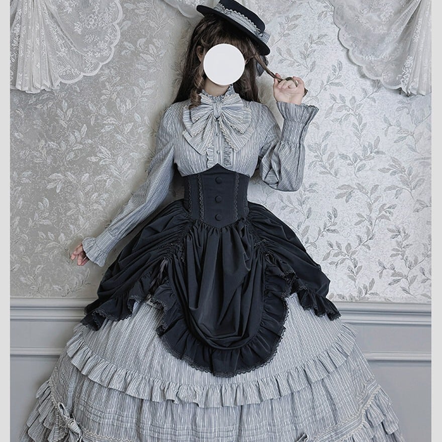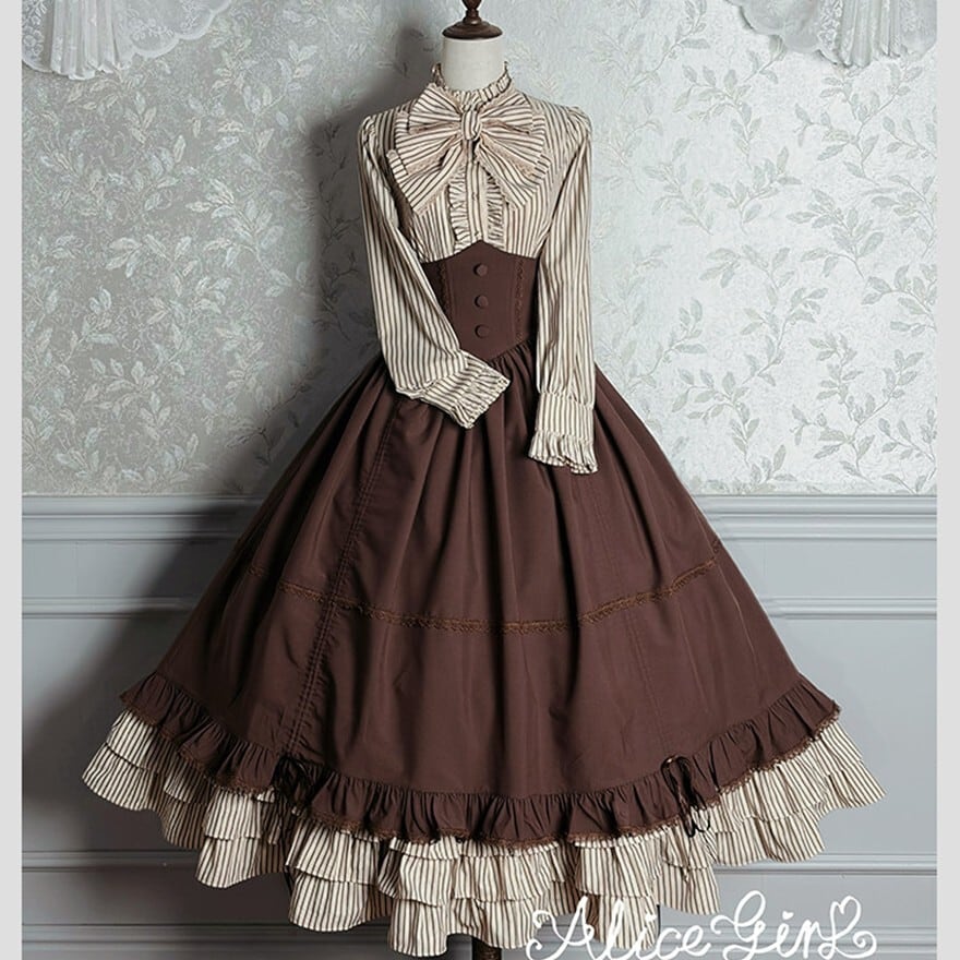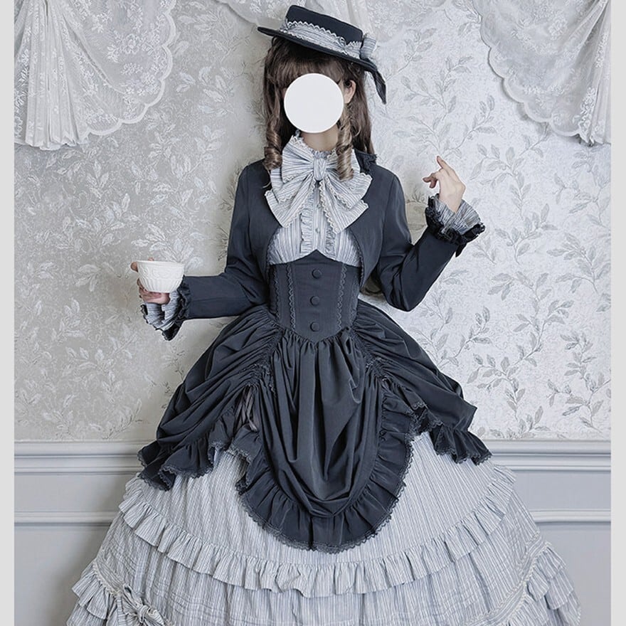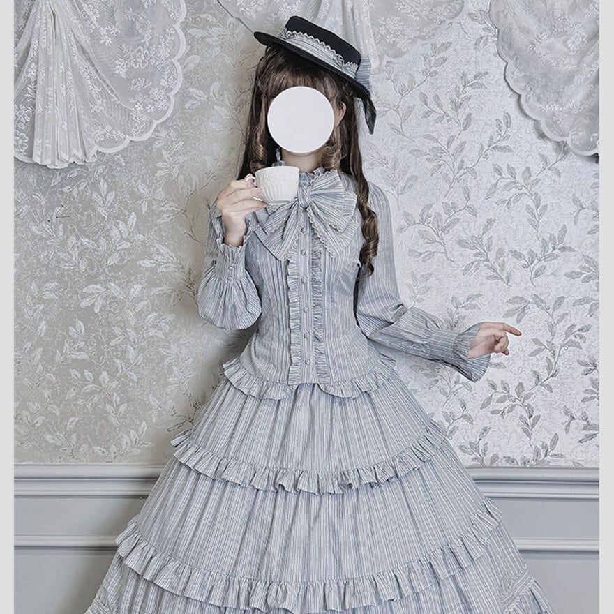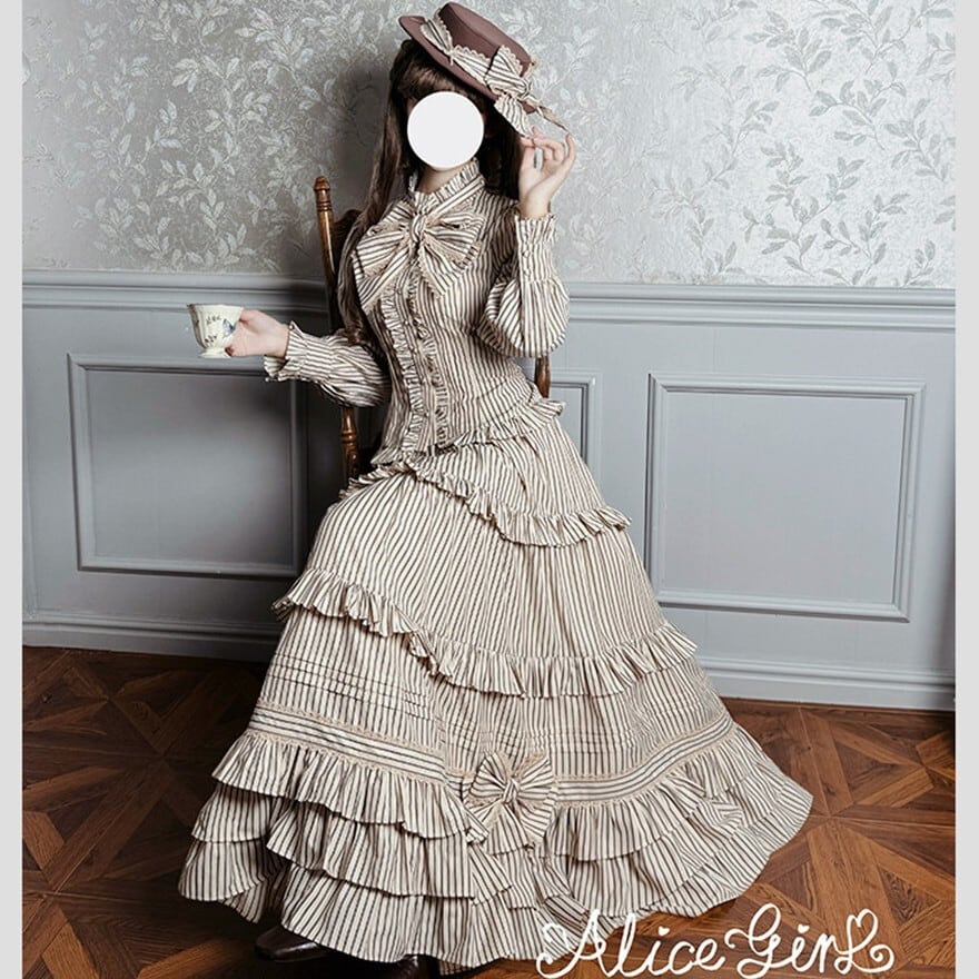 ストライプ×ティアードフリルのヴィクトリアン調シルエットで、撮影会やゴシックお茶会に映える気品を纏えます。羽織り・ブラウス・スカートの3点が揃い、コーデを選ばずトータルの世界観をそのまま完成させられるセットです。ブラウン×ベージュとダークグレー×グレーの2カラーで展開しています。