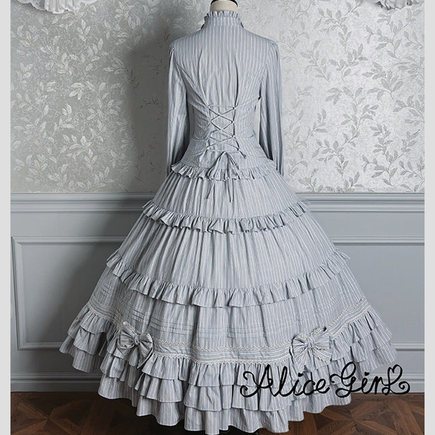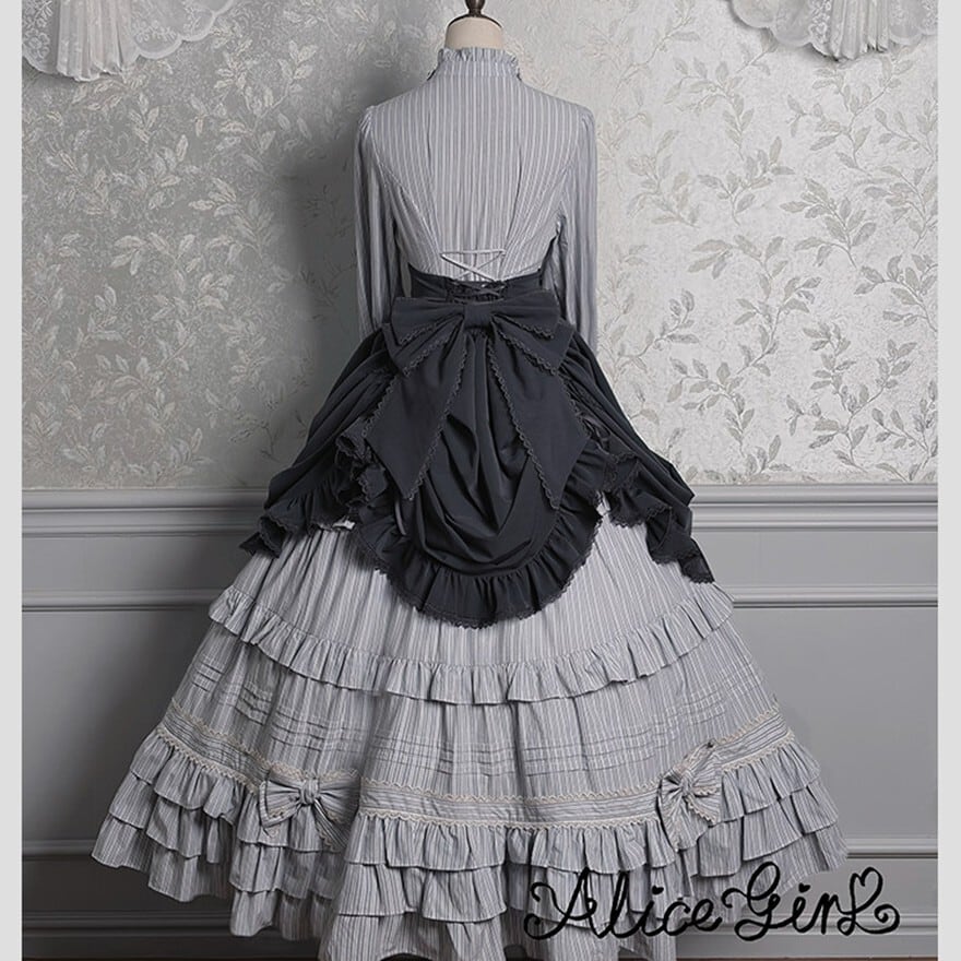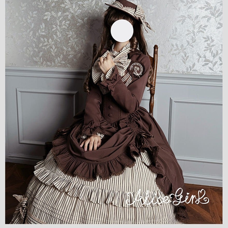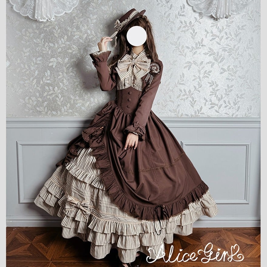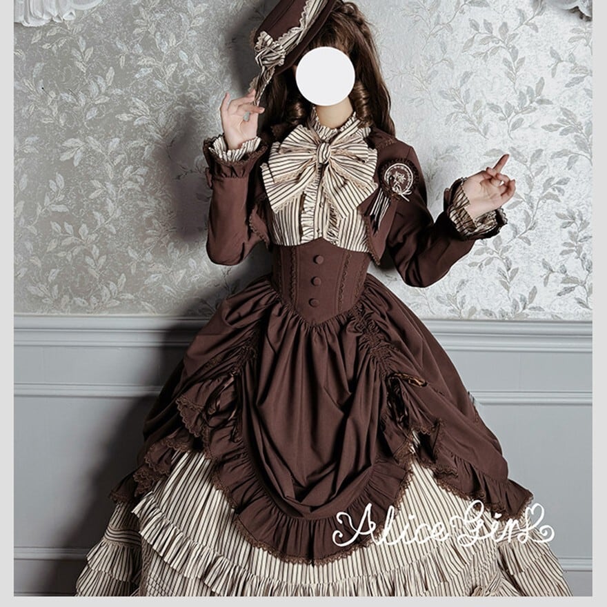 ストライプ×ティアードフリルのヴィクトリアン調シルエットで、撮影会やゴシックお茶会に映える気品を纏えます。羽織り・ブラウス・スカートの3点が揃い、コーデを選ばずトータルの世界観をそのまま完成させられるセットです。ブラウン×ベージュとダークグレー×グレーの2カラーで展開しています。