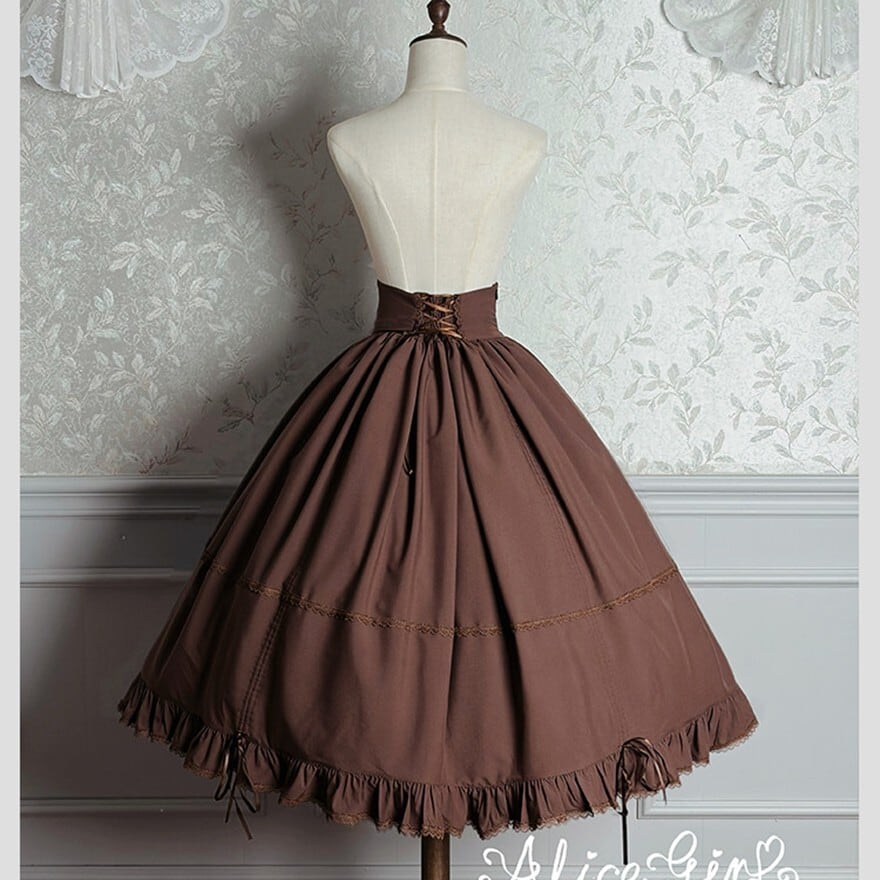 スカート:コルセット風ボタン留めハイウエスト・ストライプティアードフリル多段・サイドリボン
