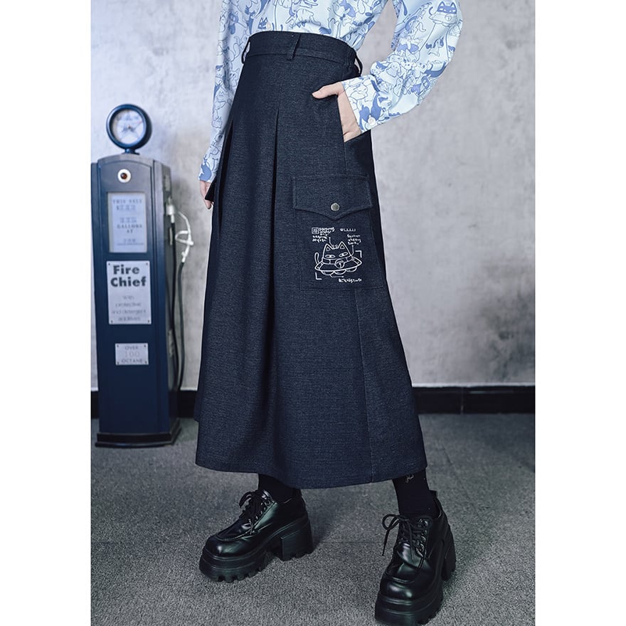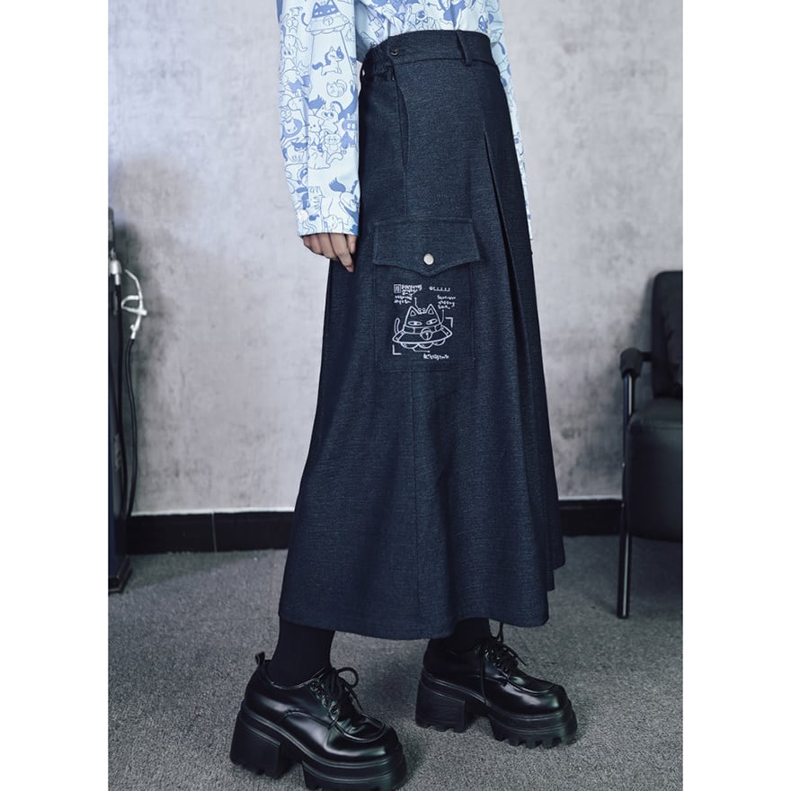 夜に溶ける猫の落書き 中華ゴシック カーゴロングスカート ダークチャコール 古怪舎|WithU