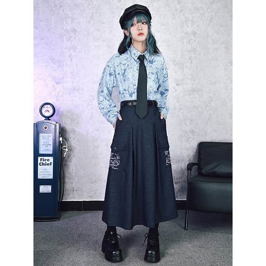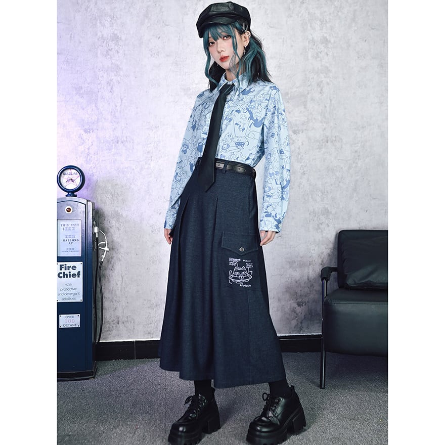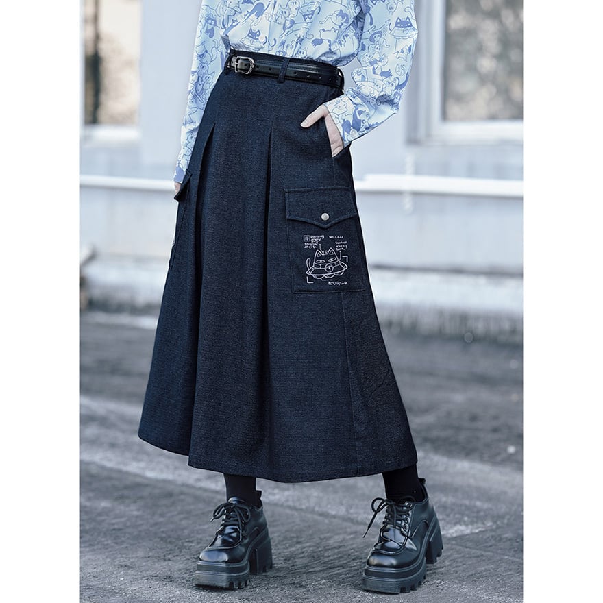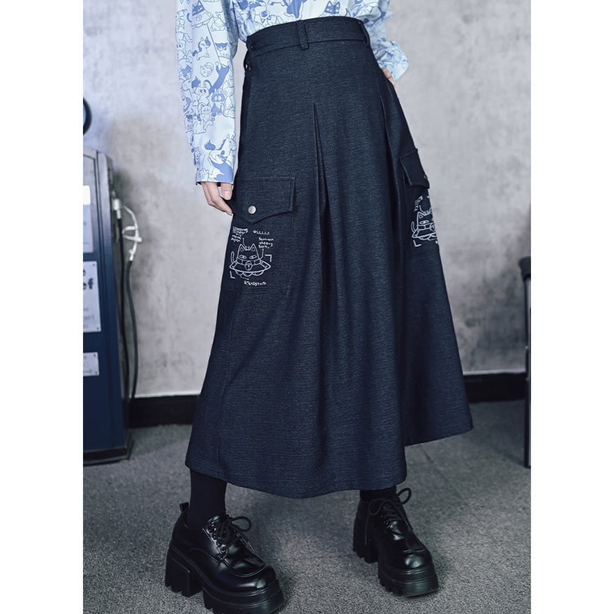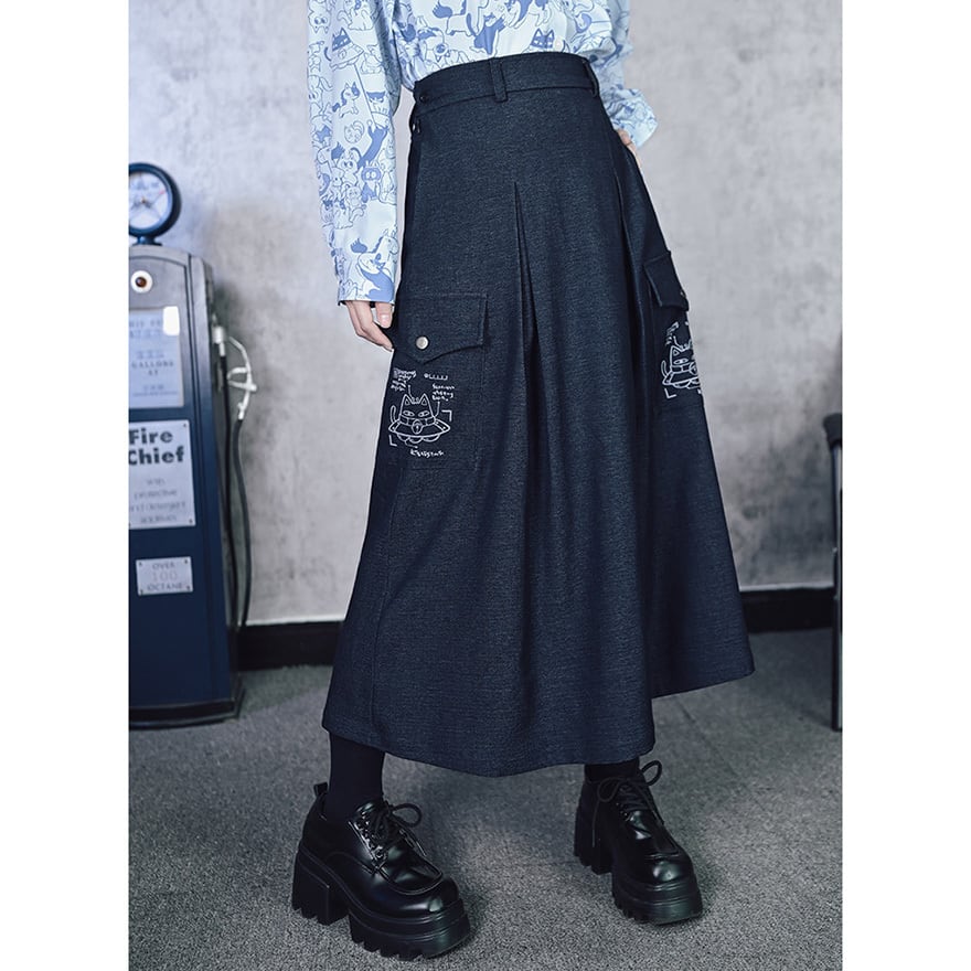 「ダーク系のスカートはどれも無地ばかりで個性が出しにくい」と感じている方に向いています。このスカートはカーゴポケット周辺の猫プリントが近づいたときに効いてくる仕掛けで、主張しすぎない絶妙なバランスを保っています。ハイウエストのAラインシルエットはコーデの重心を整えやすく、トップスを選ばずWithUらしいダーク系の空気感を自然に完成させます。