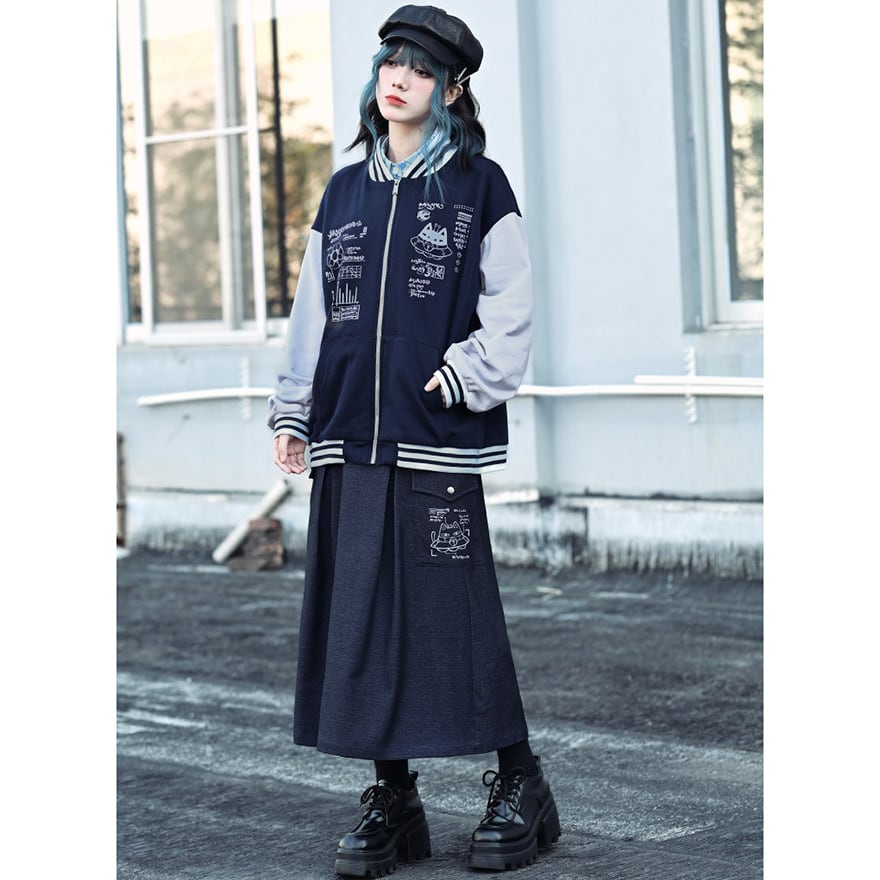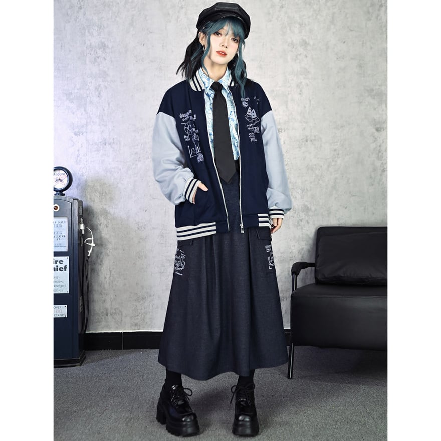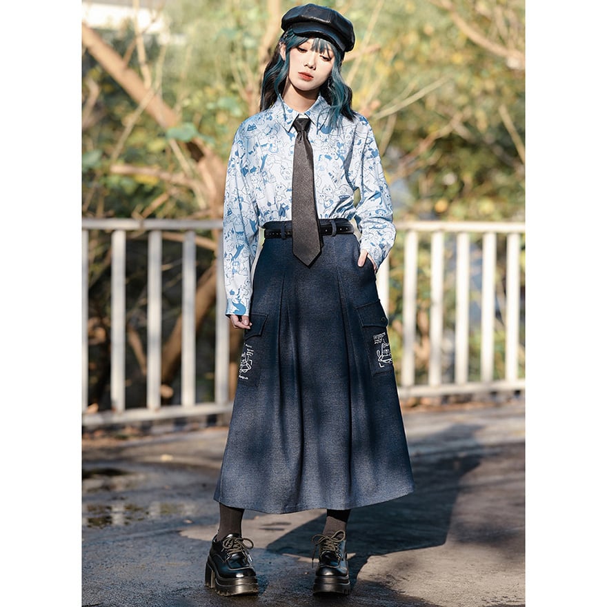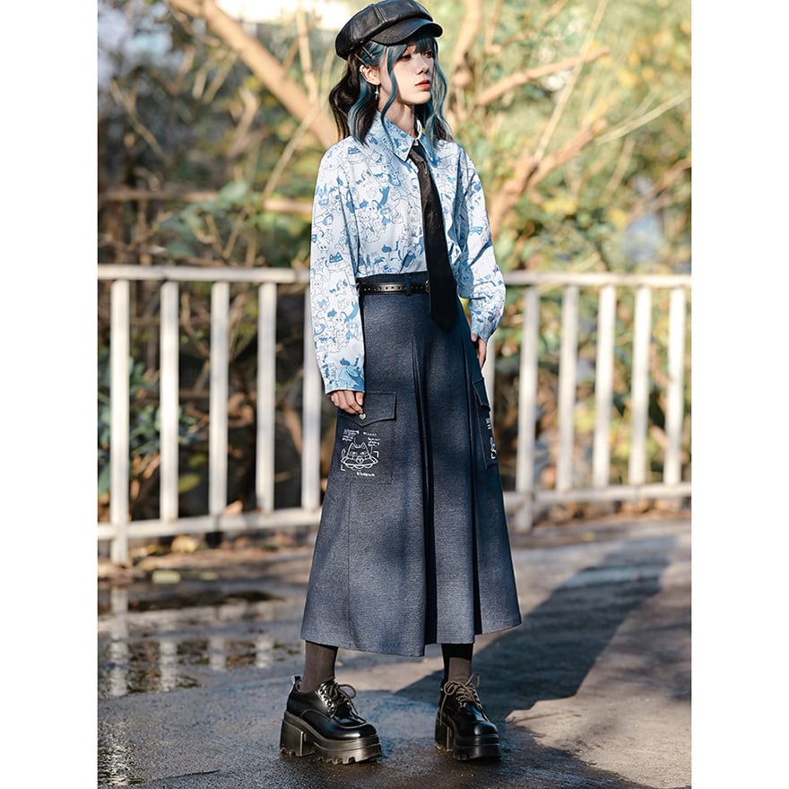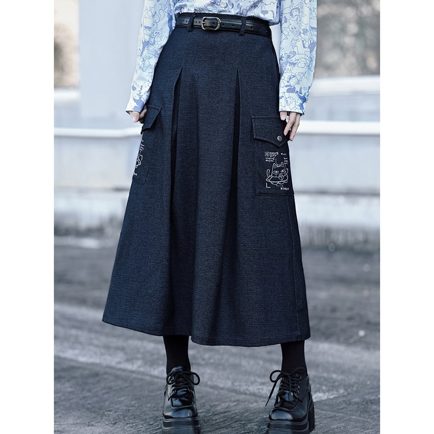 「ダーク系のスカートはどれも無地ばかりで個性が出しにくい」と感じている方に向いています。このスカートはカーゴポケット周辺の猫プリントが近づいたときに効いてくる仕掛けで、主張しすぎない絶妙なバランスを保っています。ハイウエストのAラインシルエットはコーデの重心を整えやすく、トップスを選ばずWithUらしいダーク系の空気感を自然に完成させます。