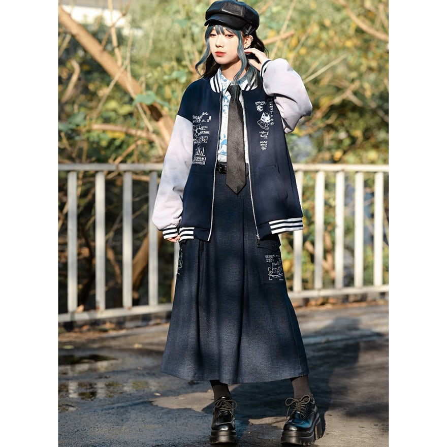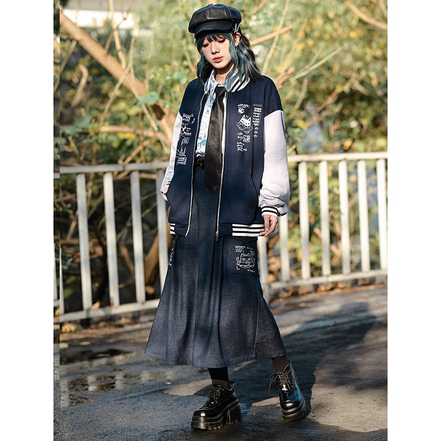 中華ゴシックブランド、古怪舎によるダークチャコールのAラインシルエットに、ホワイトの猫ラインアートプリントを配したボトムスで、ダーク系ストリートコーデやゴシックカジュアルに退廃的なユーモアをさりげなく加えます。