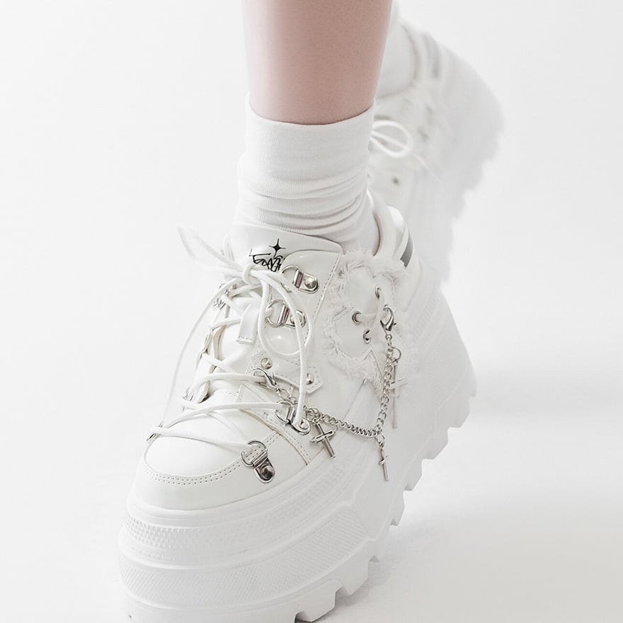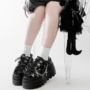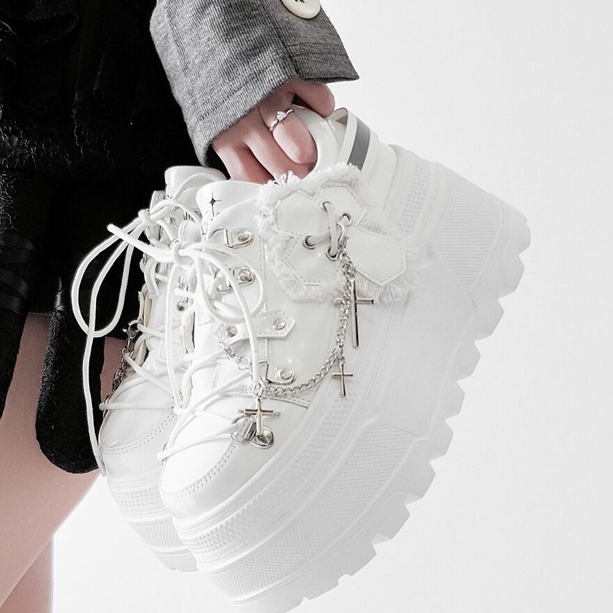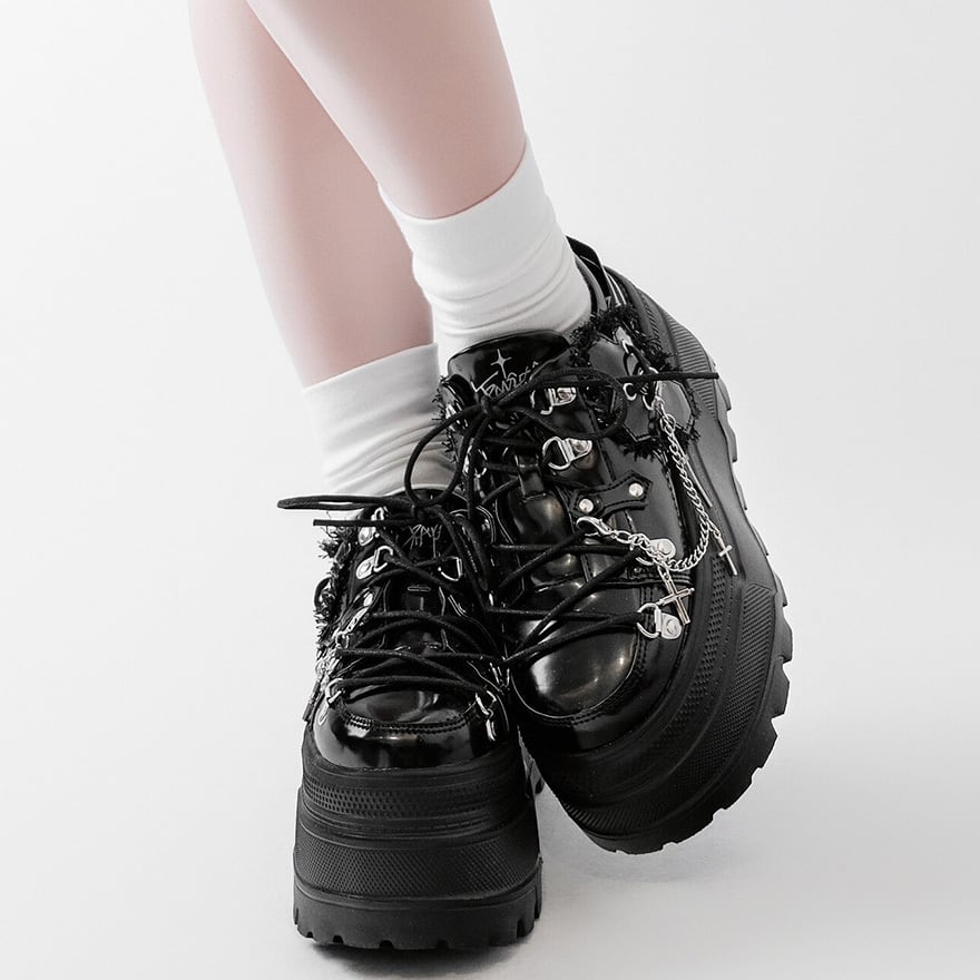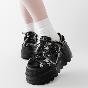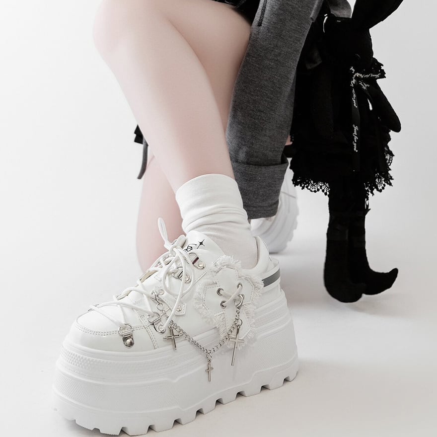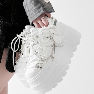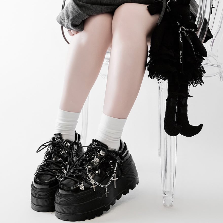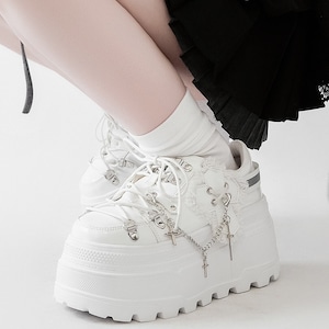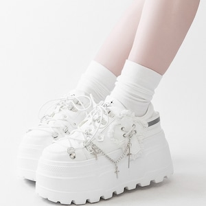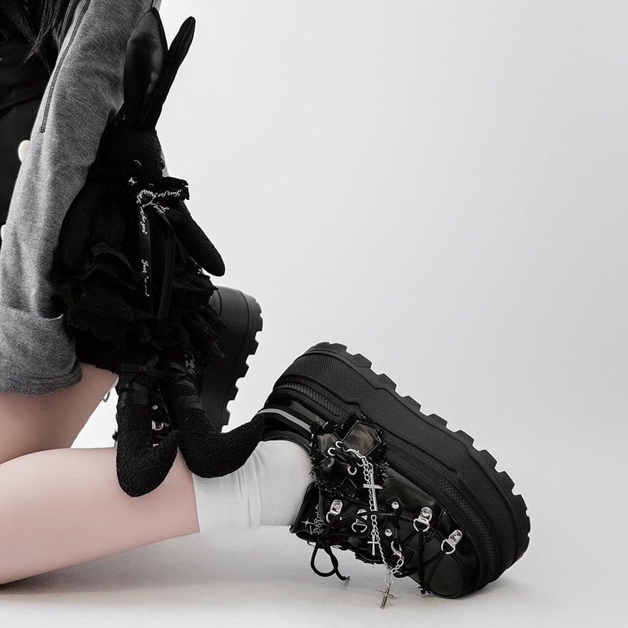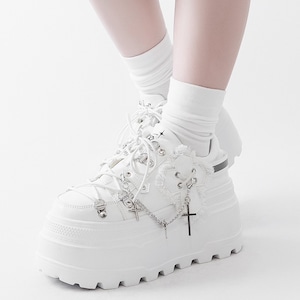 ダブルリボンとチェーン、十字架チャームを効かせた存在感ある足元で、ライブや撮影会で視線を集めるコーデに最適な厚底スニーカーです。黒は重厚に、白は退廃的な甘さを引き立て、ミニ丈の装いをいっそう印象的に見せてくれます。