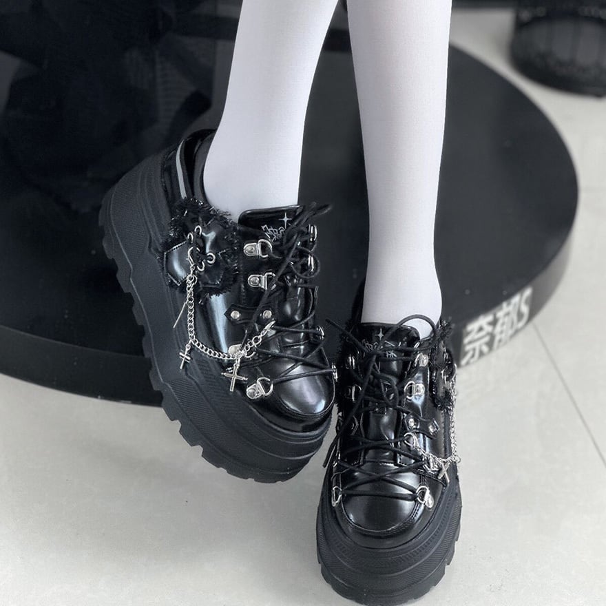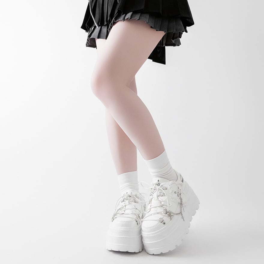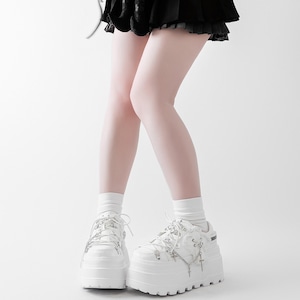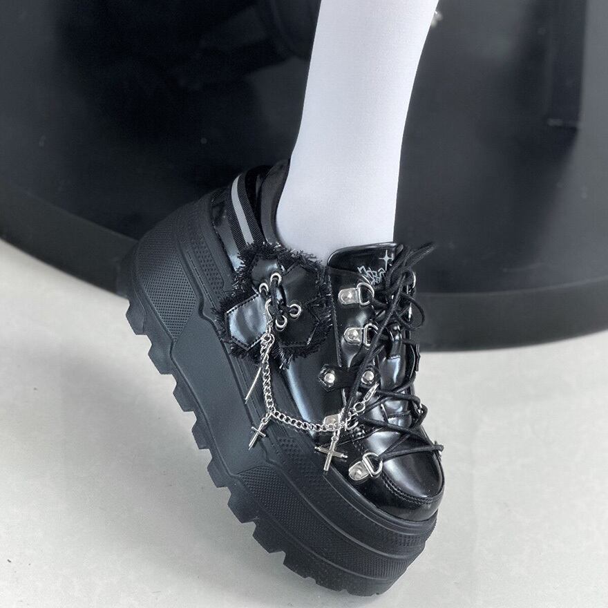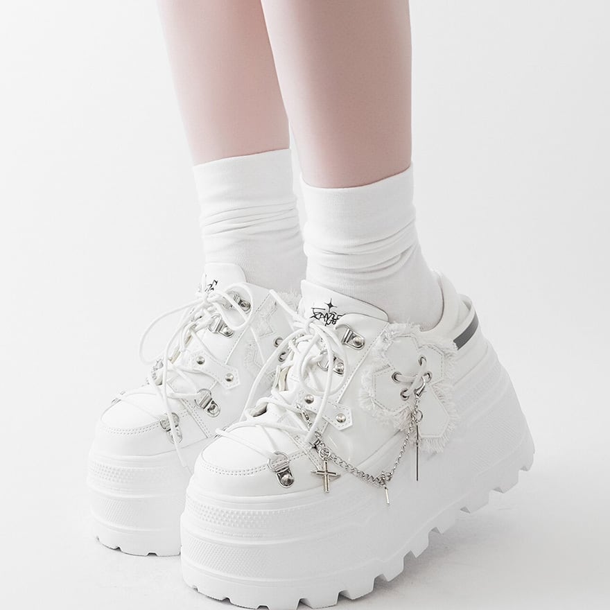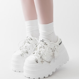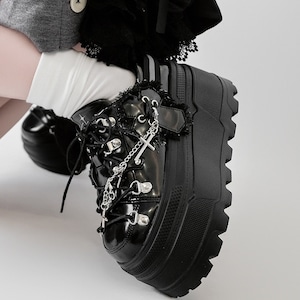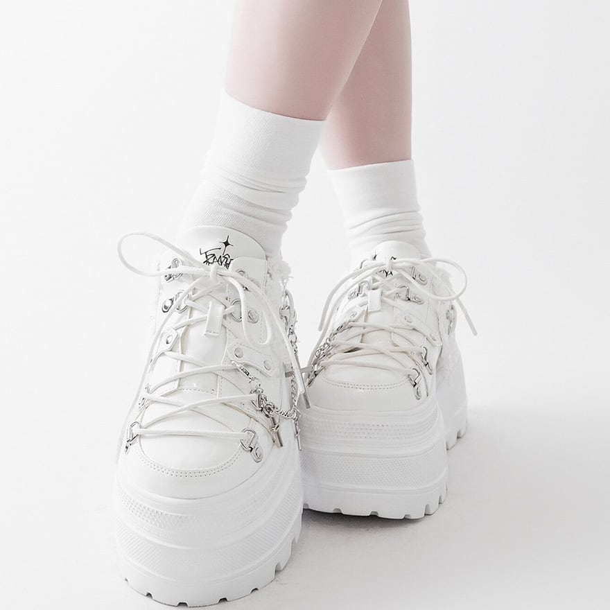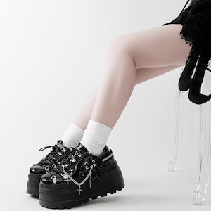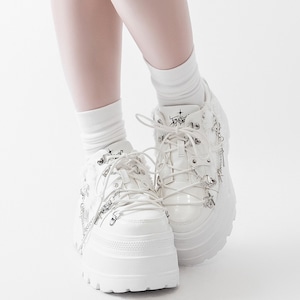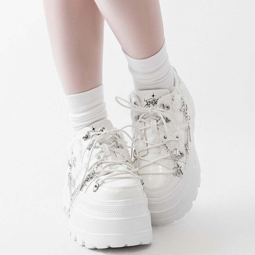 ダブルリボンとチェーン、十字架チャームを効かせた存在感ある足元で、ライブや撮影会で視線を集めるコーデに最適な厚底スニーカーです。黒は重厚に、白は退廃的な甘さを引き立て、ミニ丈の装いをいっそう印象的に見せてくれます。