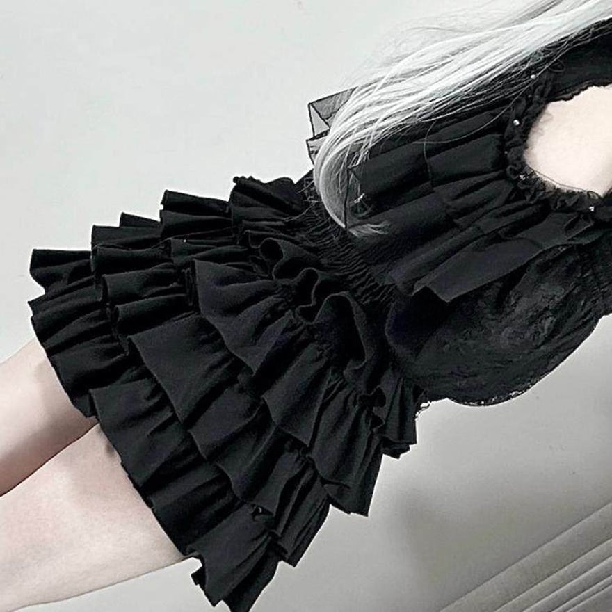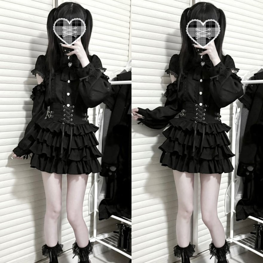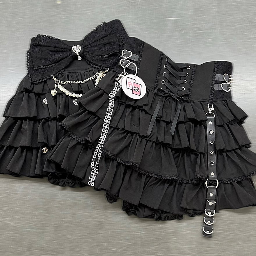 重なるフリルとチェーン装飾、編み上げのアクセントが印象的で、ライブやイベントで甘さと辛さをバランスよく見せたい日にぴったりです。動くたびに揺れる裾が、黒一色のコーデにも高揚感を添えてくれます。