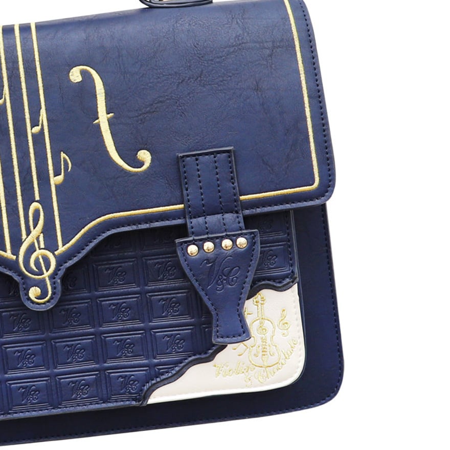 ヴァイオリンを思わせるライン使いと楽譜チャームが印象的な、クラシカルな空気を纏える一点です。重厚感のある配色に音楽モチーフを重ねることで、甘さだけに寄らない気品あるゴシックコーデを演出。おでかけやイベント、音楽モチーフの装いを楽しみたい日に存在感を添えてくれます。