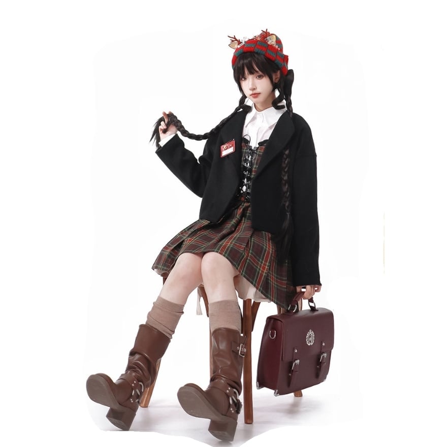 タータンチェックのビスチェとアシンメトリー裾のスカートが印象的で、学院風の物語を感じるおでかけや撮影に最適です。クラシカルな可愛さの中に少し反骨的な遊び心を効かせた、甘すぎないチェックコーデを楽しめます。