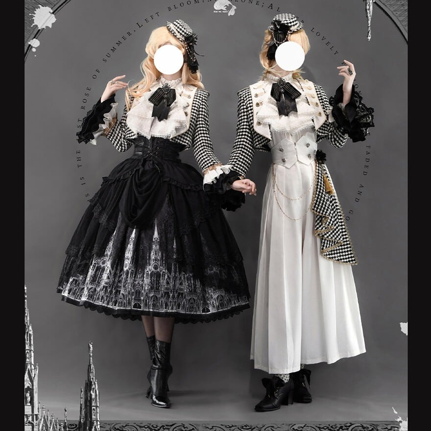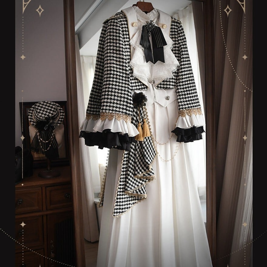 王子系ロリィタ5点セットは、千鳥格子ジャケットとロングパンツ、サイドマントが織りなす端正なシルエットが特徴で、撮影会やイベントで貴族感のある少年装コーデを完成させたい方に最適です。黒と白のコントラストに重厚な装飾が映え、纏うだけで凛とした存在感を引き立てます。