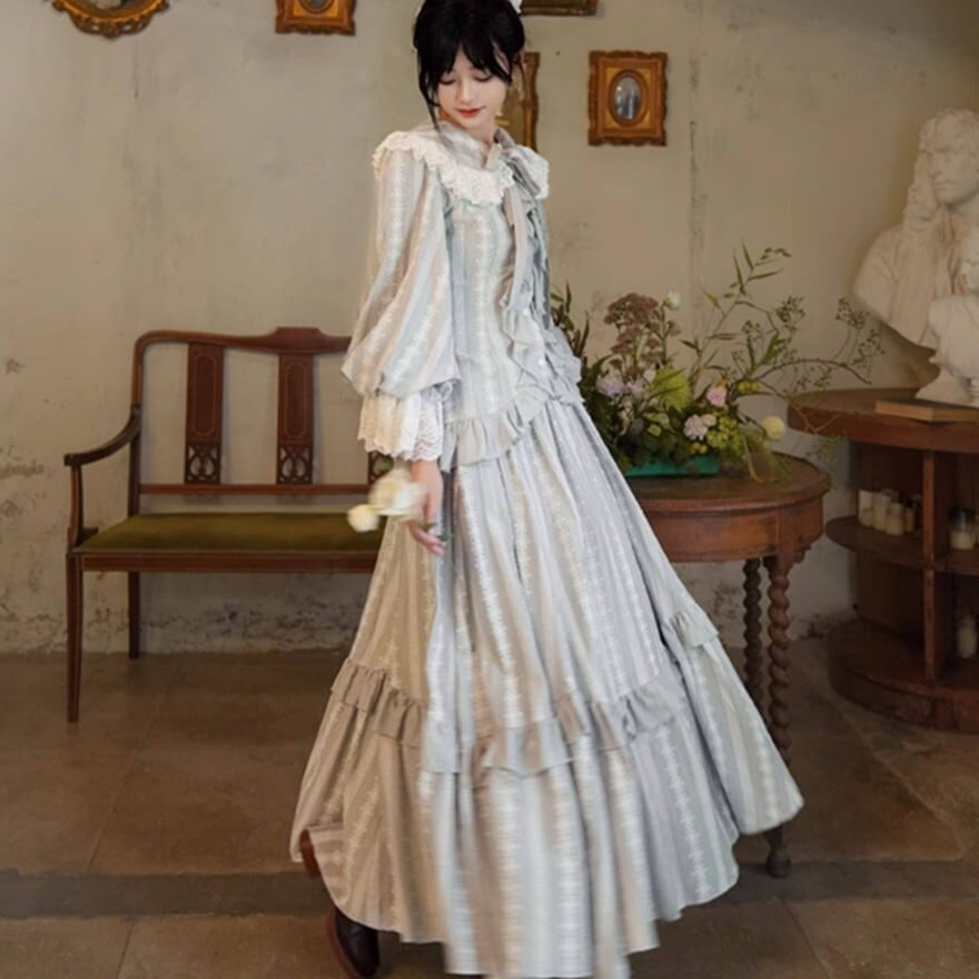 銀灰の縦ライン生地と大きな襟、段フリルの重なりが特徴で、撮影会やおでかけで静かな気品を纏いたい方に最適です。淡い色味でありながら印象がぼやけにくく、凛とした佇まいを作りやすい一着です。