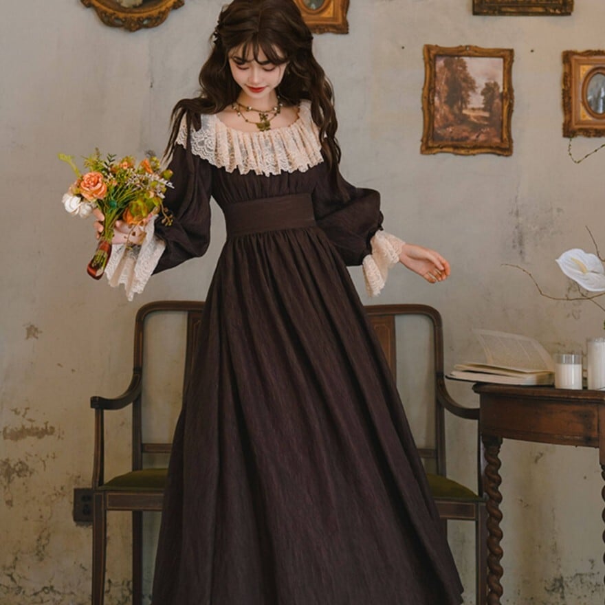 深いブラウンのジャカード生地と広めの襟元、ふくらみのある袖が特徴で、秋冬の撮影会やクラシカルなおでかけに最適です。落ち着いた色味の中にやわらかな陰影が生まれ、静かな品格を纏えます。